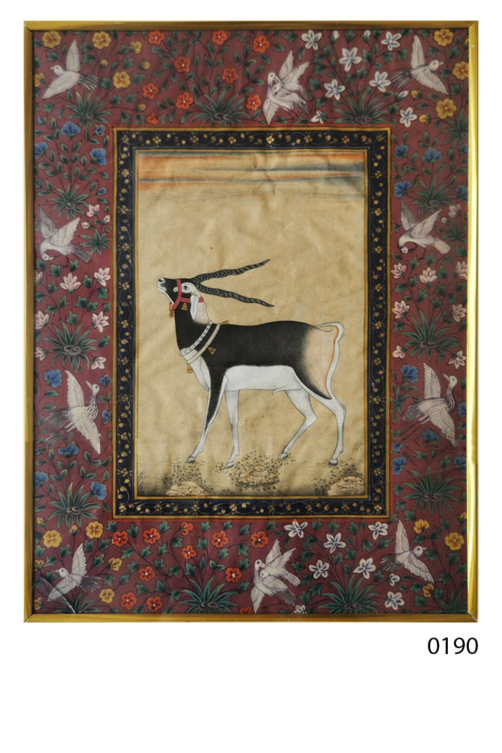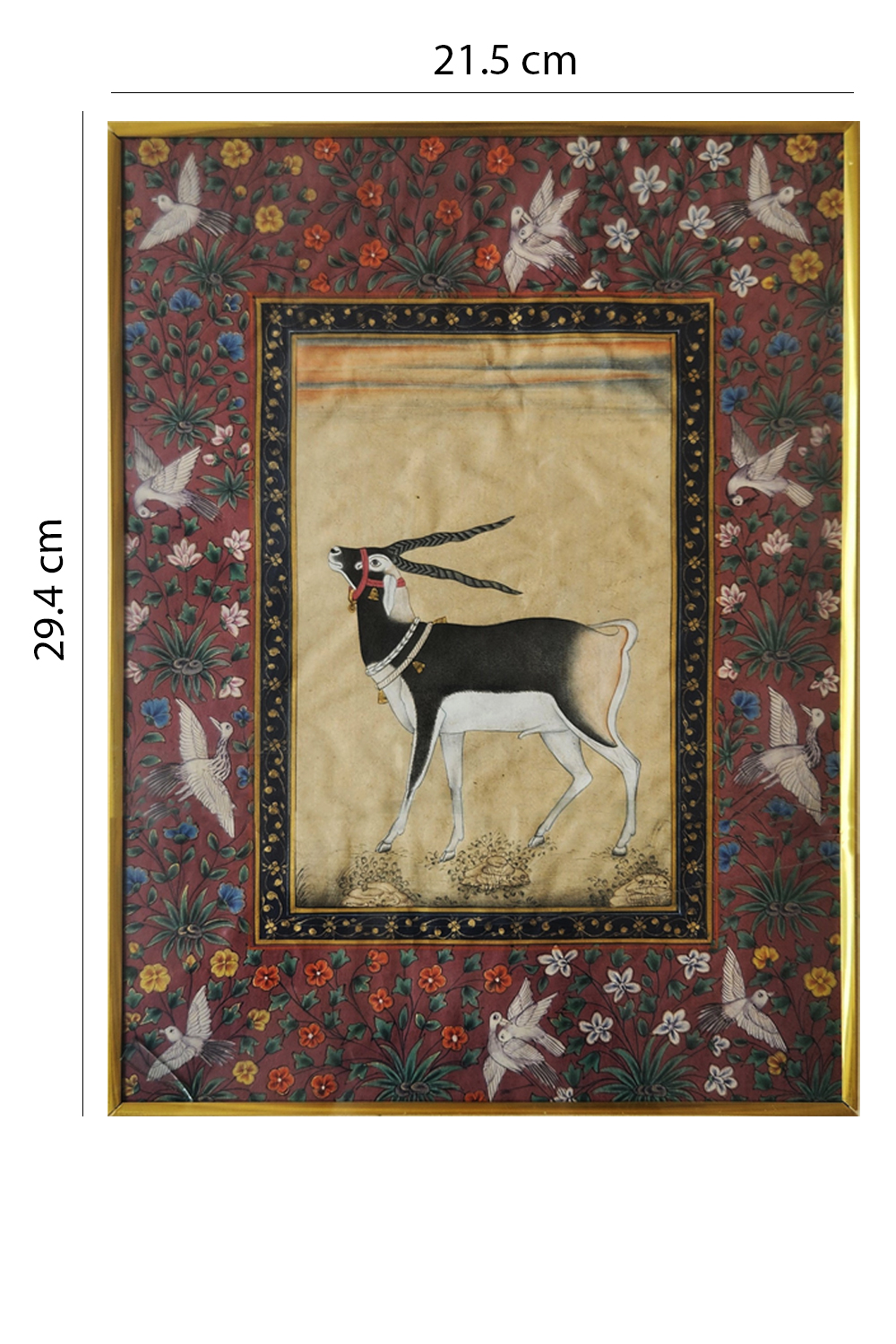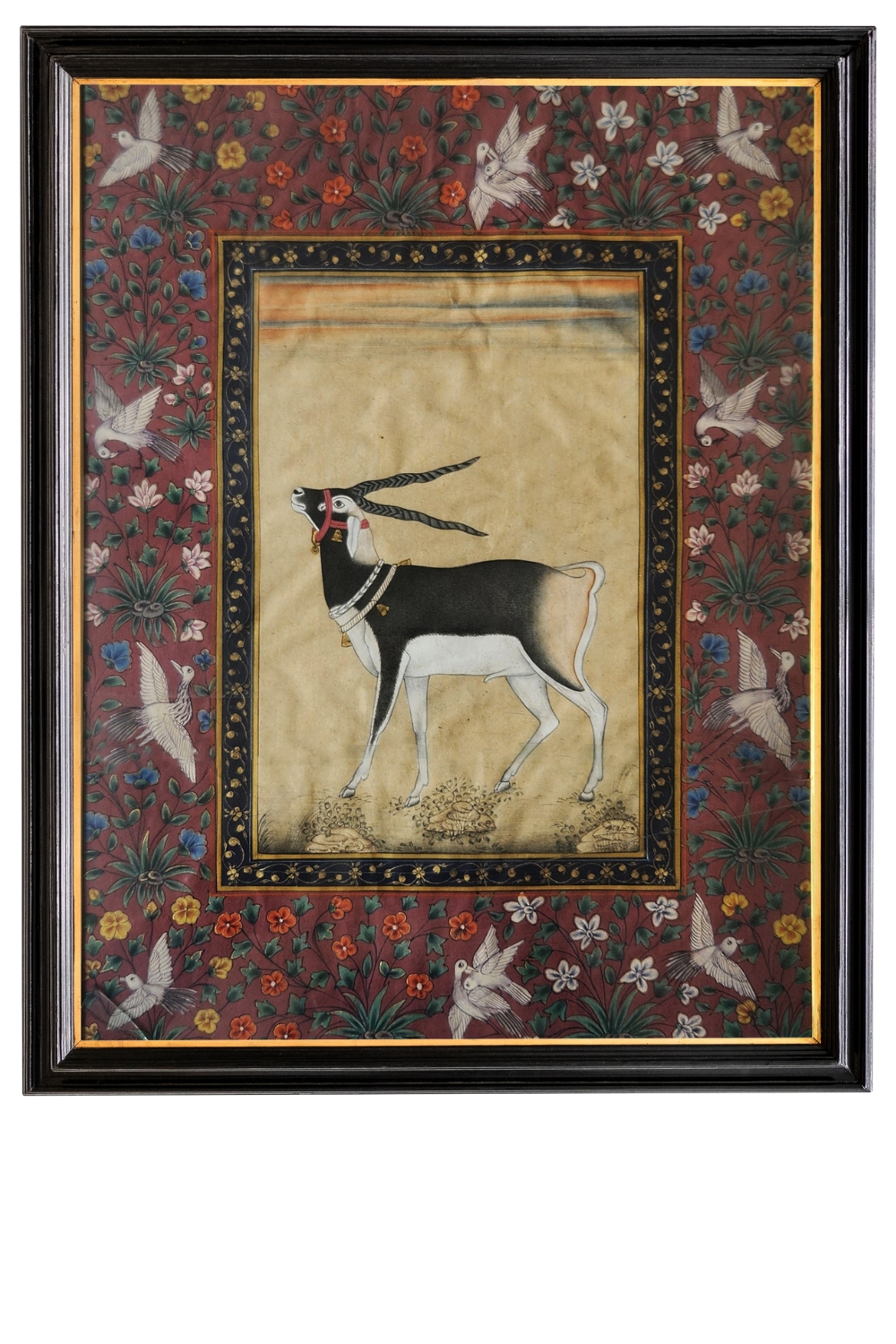 This exquisite miniature painting features a blackbuck, a species of antelope, depicted with intricate detail and adorned with jewelry around its neck. The blackbuck stands gracefully on a neutral background, which contrasts beautifully with the vibrant floral border surrounding it. The border is rich with colorful flowers and birds, adding a lively and dynamic element to the composition. The painting is framed with a decorative border that enhances its elegance and draws attention to the central figure of the blackbuck. The use of colors, attention to detail, and the harmonious composition make this painting a captivating piece of art.