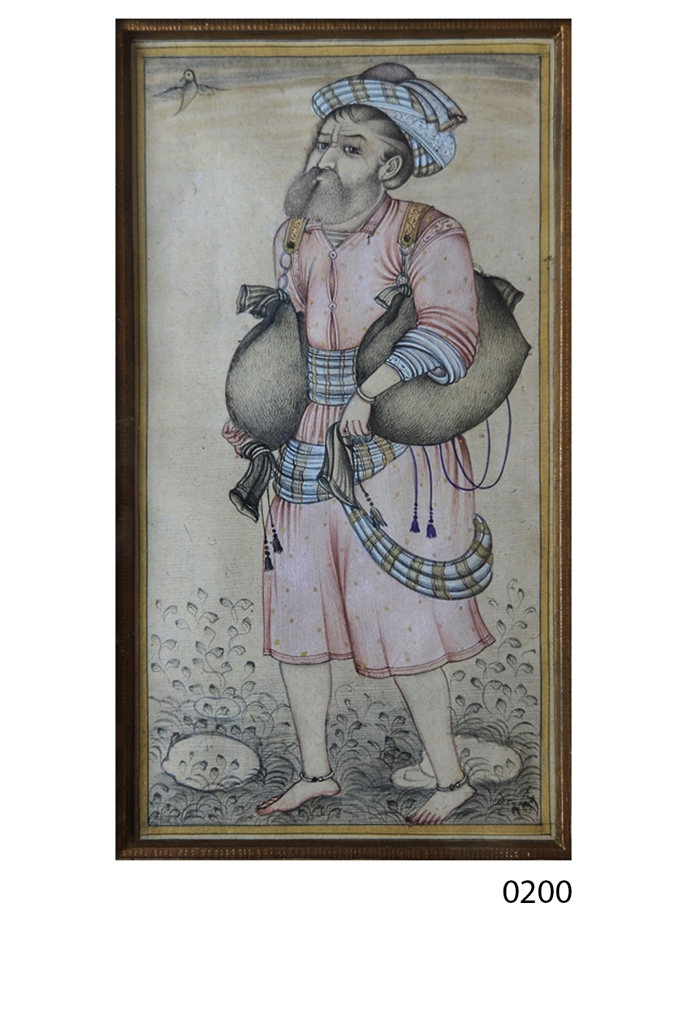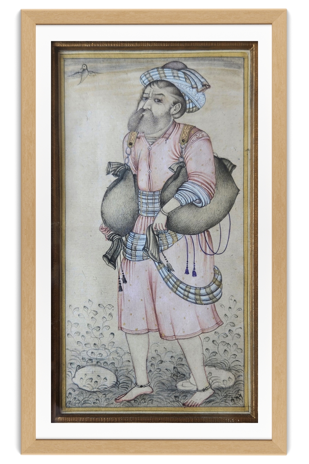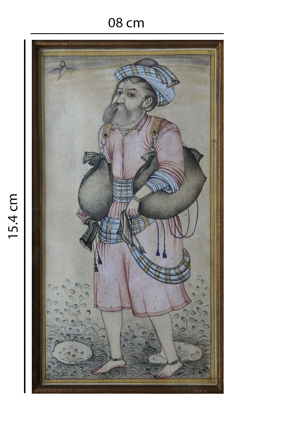 This exquisite miniature painting portrays a water carrier dressed in traditional attire, carrying two large water bags. The figure is adorned with a turban and a robe, both intricately detailed with patterns and colors. The painting features: