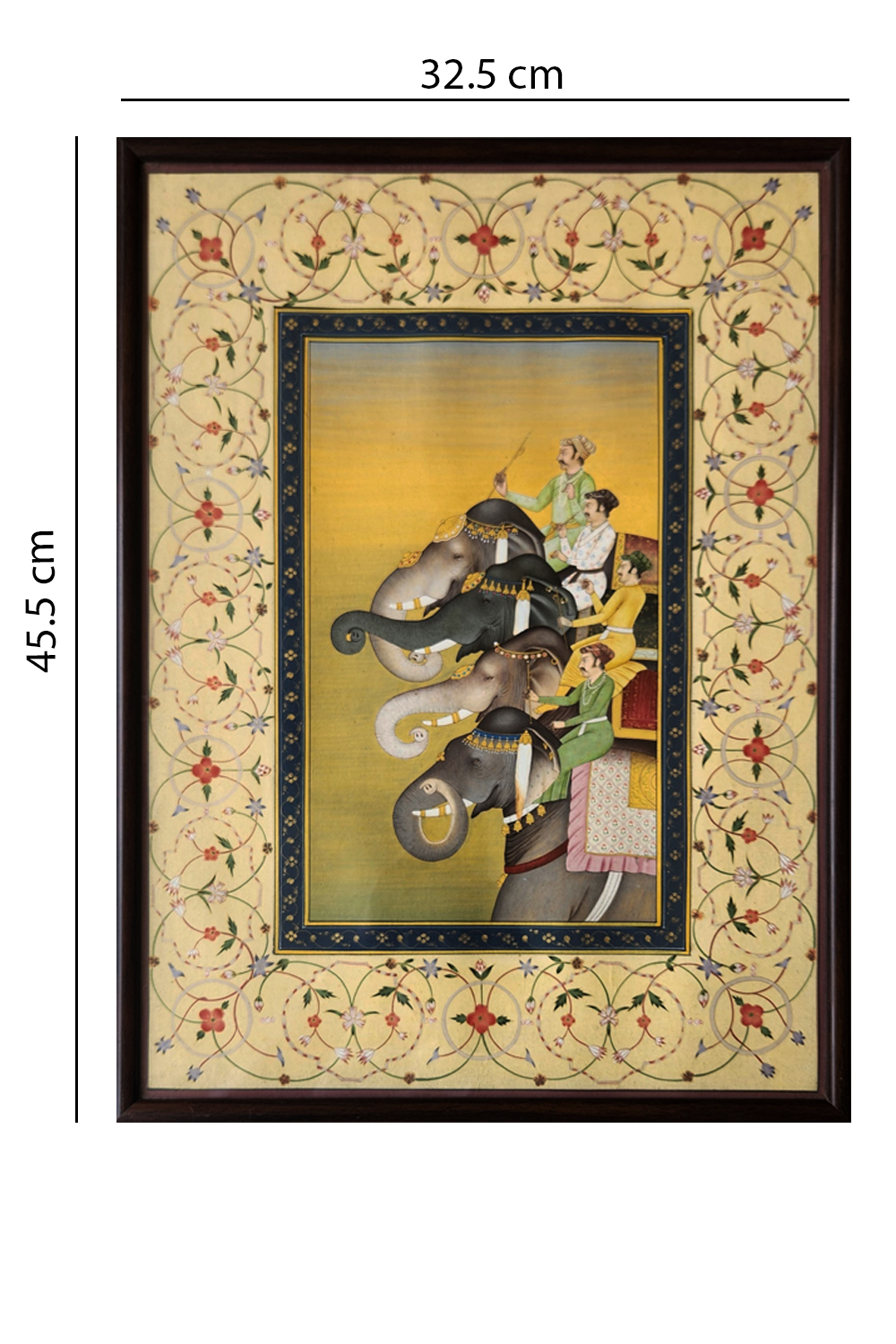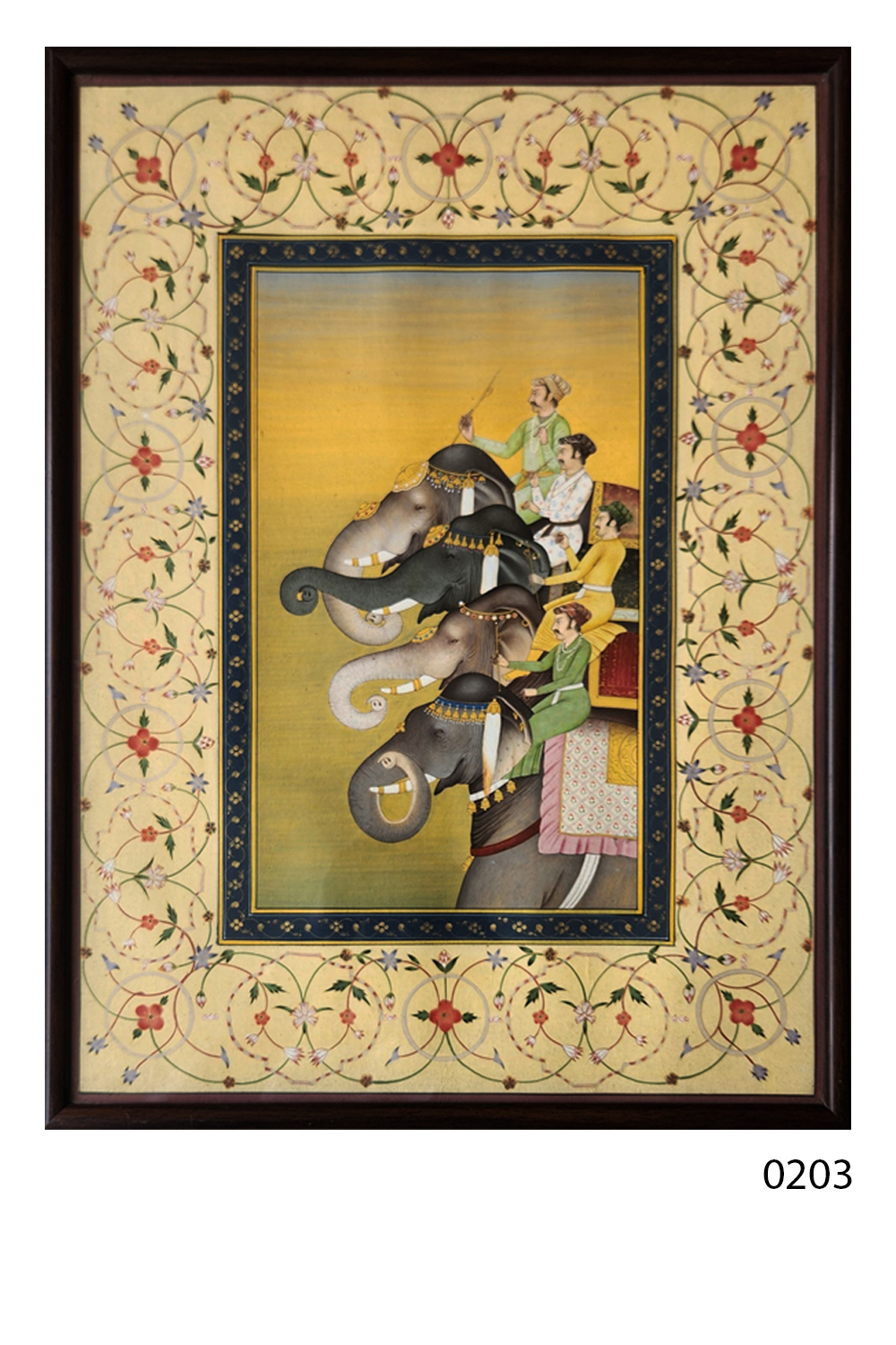 The painting is framed by an elaborate floral border, enhancing its aesthetic appeal.