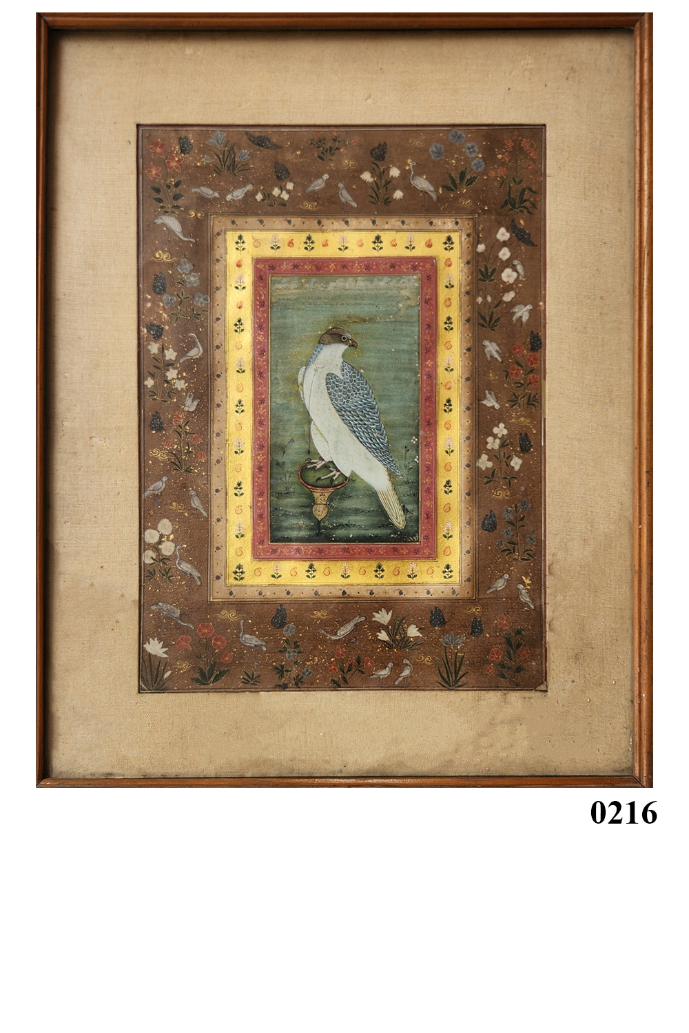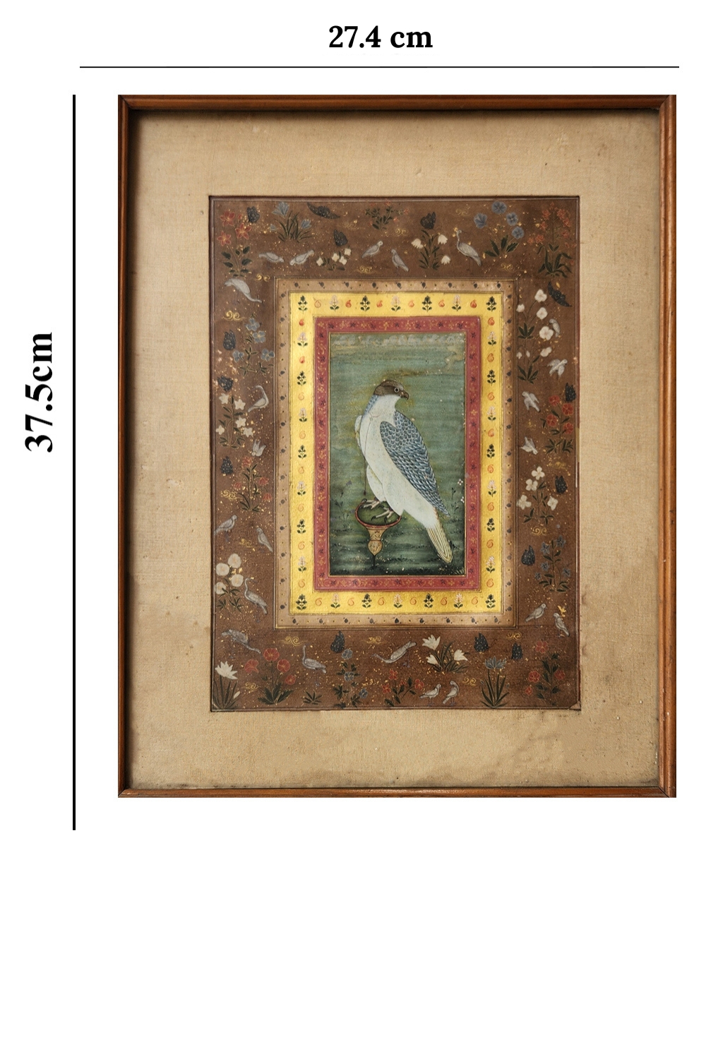 This exquisite miniature painting showcases a regal falcon perched on an intricately designed stand. The central image is framed by a vibrant yellow and red border, which is further enclosed by a rich brown border adorned with delicate floral and avian motifs. The painting is characterized by: