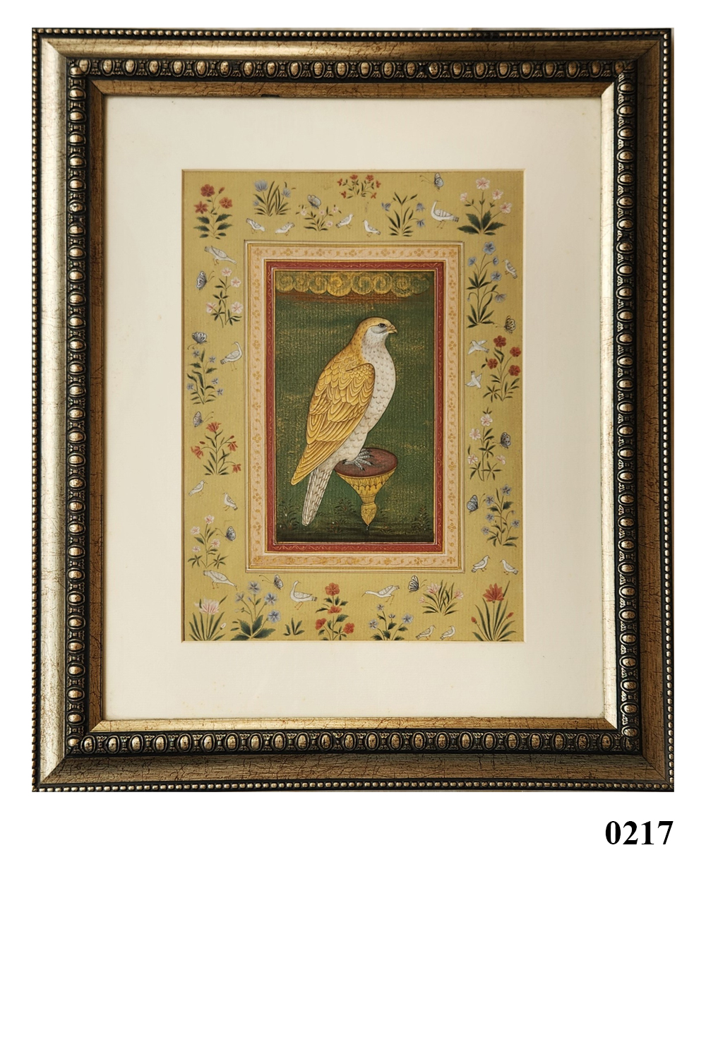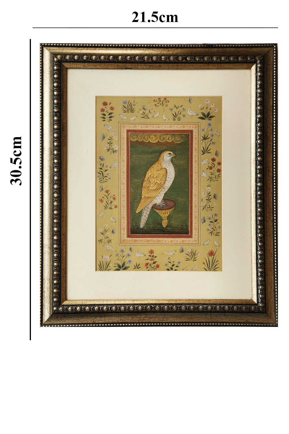 This exquisite miniature painting showcases a regal falcon perched on an intricately designed stand. The central image is framed by a vibrant yellow and red border, which is further enclosed by a rich brown border adorned with delicate floral and avian motifs. The painting is characterized by: