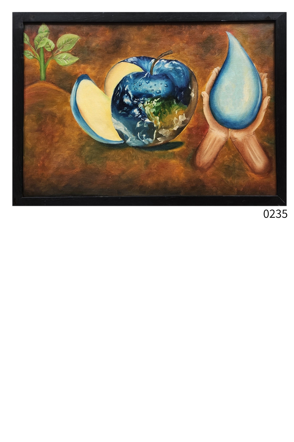 This oil painting, titled "Essence of Earth," captures the delicate balance of nature through symbolic imagery. The central focus is a blue apple, with the Earth's continents and oceans painted on its surface, representing the planet's natural bounty. Slices of the apple lie beside it, emphasizing the idea of sharing and sustainability. To the right, a pair of hands gently cradles a large water droplet, symbolizing the preciousness of water. In the background, a small plant with green leaves signifies growth and renewal. The painting's earthy tones and surreal elements create a thought-provoking piece that highlights the importance of environmental conservation.