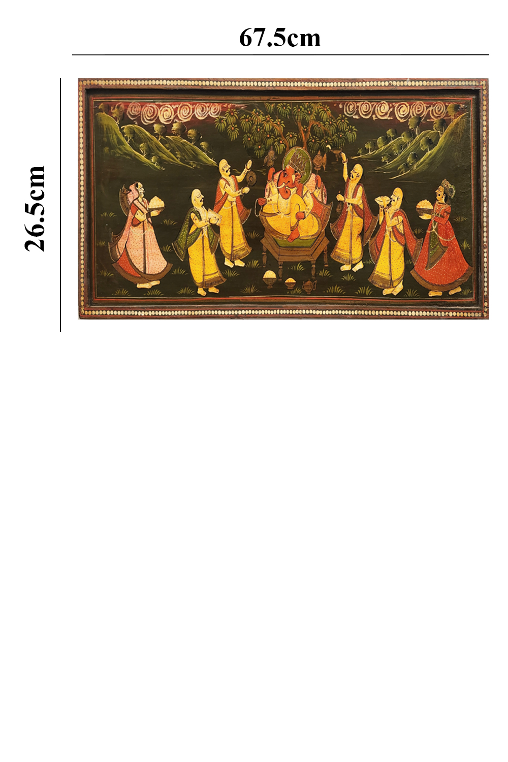 Intricate patterns and vibrant colors in the attire of the figures.