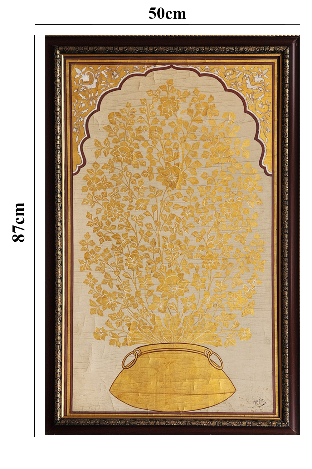 This exquisite panel painting showcases a detailed and intricate golden floral design, emanating from a traditional vase. The artwork is framed with an ornate border that enhances its elegance. The painting features: