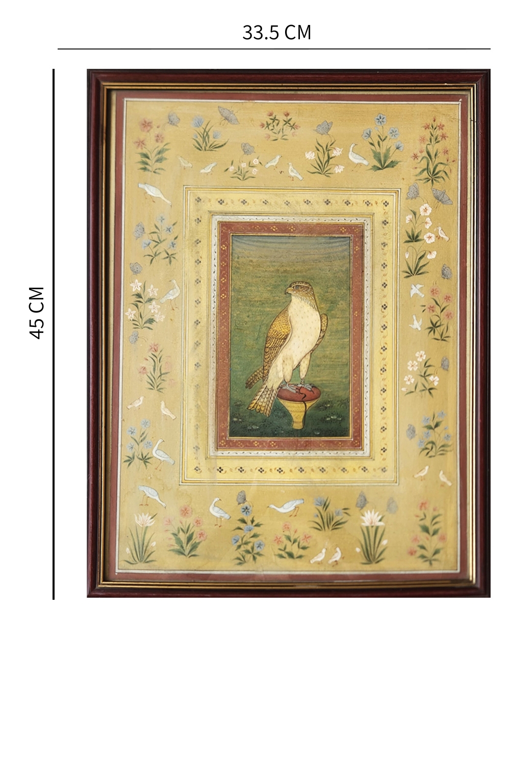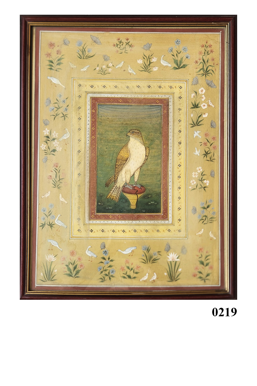 This exquisite miniature painting showcases a regal falcon perched on a decorative stand, set against a green background. The painting is framed by multiple borders, each adorned with delicate patterns. The outermost border features an array of flowers and birds, adding to the painting's intricate beauty. Key features include: