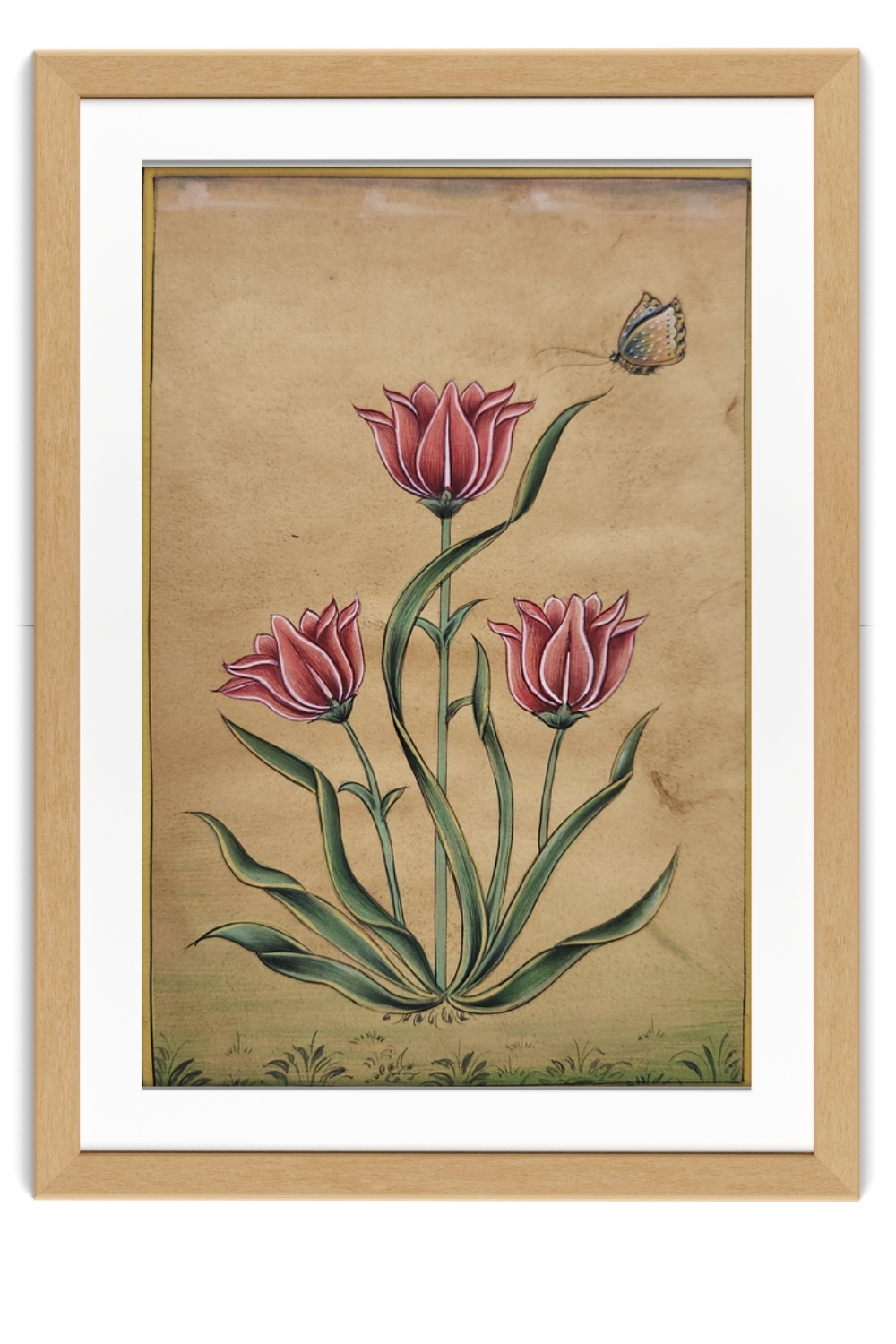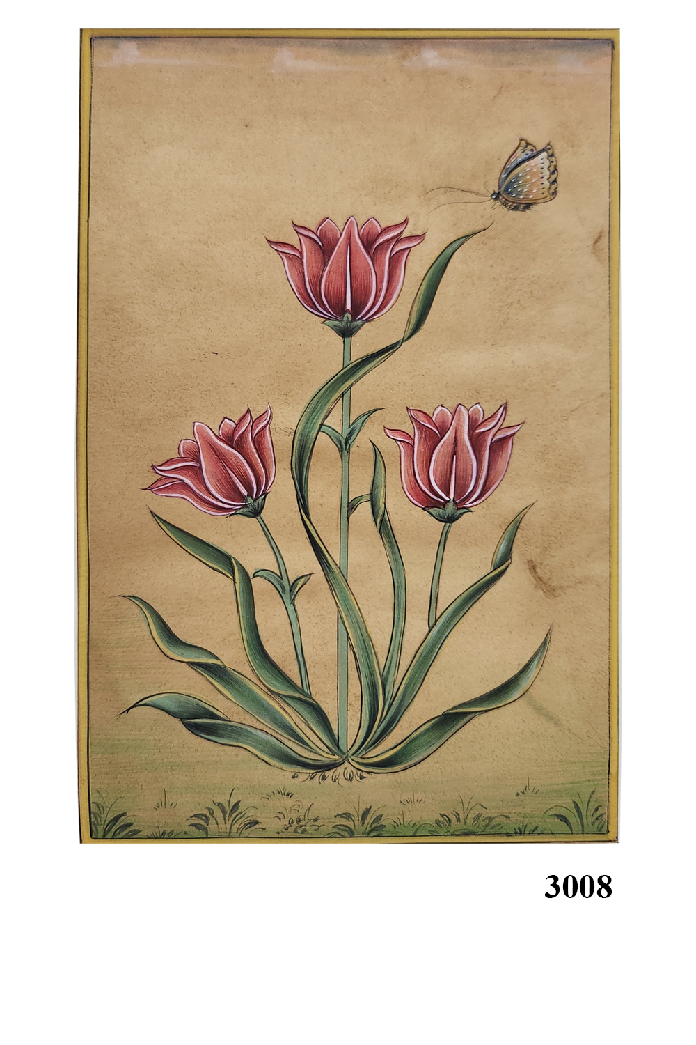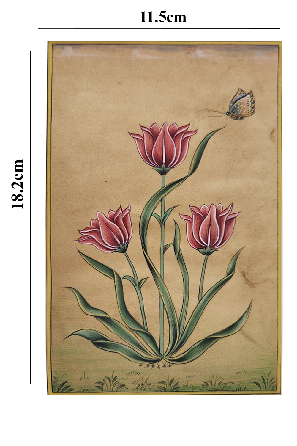 This exquisite miniature painting showcases the elegance of nature through its detailed depiction of three tulips in full bloom, accompanied by a butterfly. The artwork is characterized by: