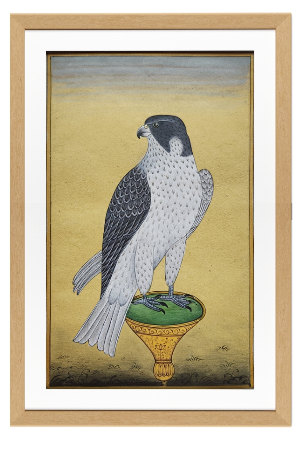 This exquisite miniature painting captures the regal presence of a falcon, meticulously rendered with fine brushwork and attention to detail. The falcon is depicted with a striking combination of white and dark feathers, standing proudly on a green and gold ornate perch. The background is a subtle gradient of yellow and gray, which enhances the focus on the bird. The painting exemplifies traditional miniature art techniques, characterized by:
