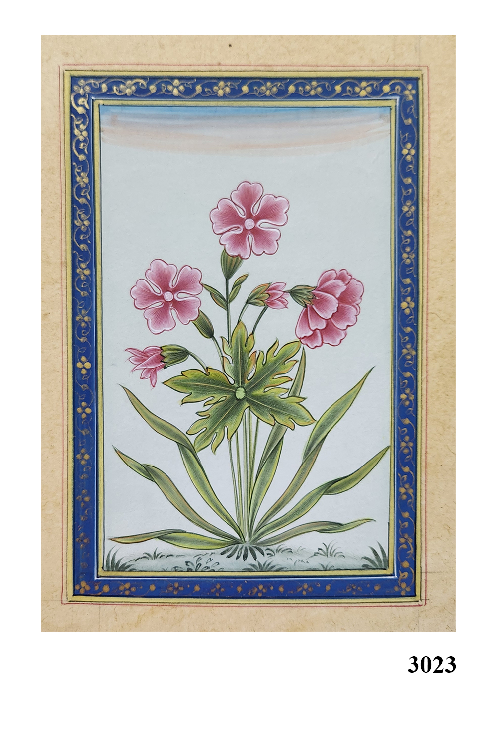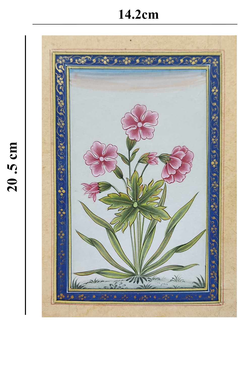 This exquisite miniature painting showcases a beautifully detailed flowering plant with pink blossoms. The artwork is framed with an ornate blue and gold border, enhancing its elegance. The painting features: