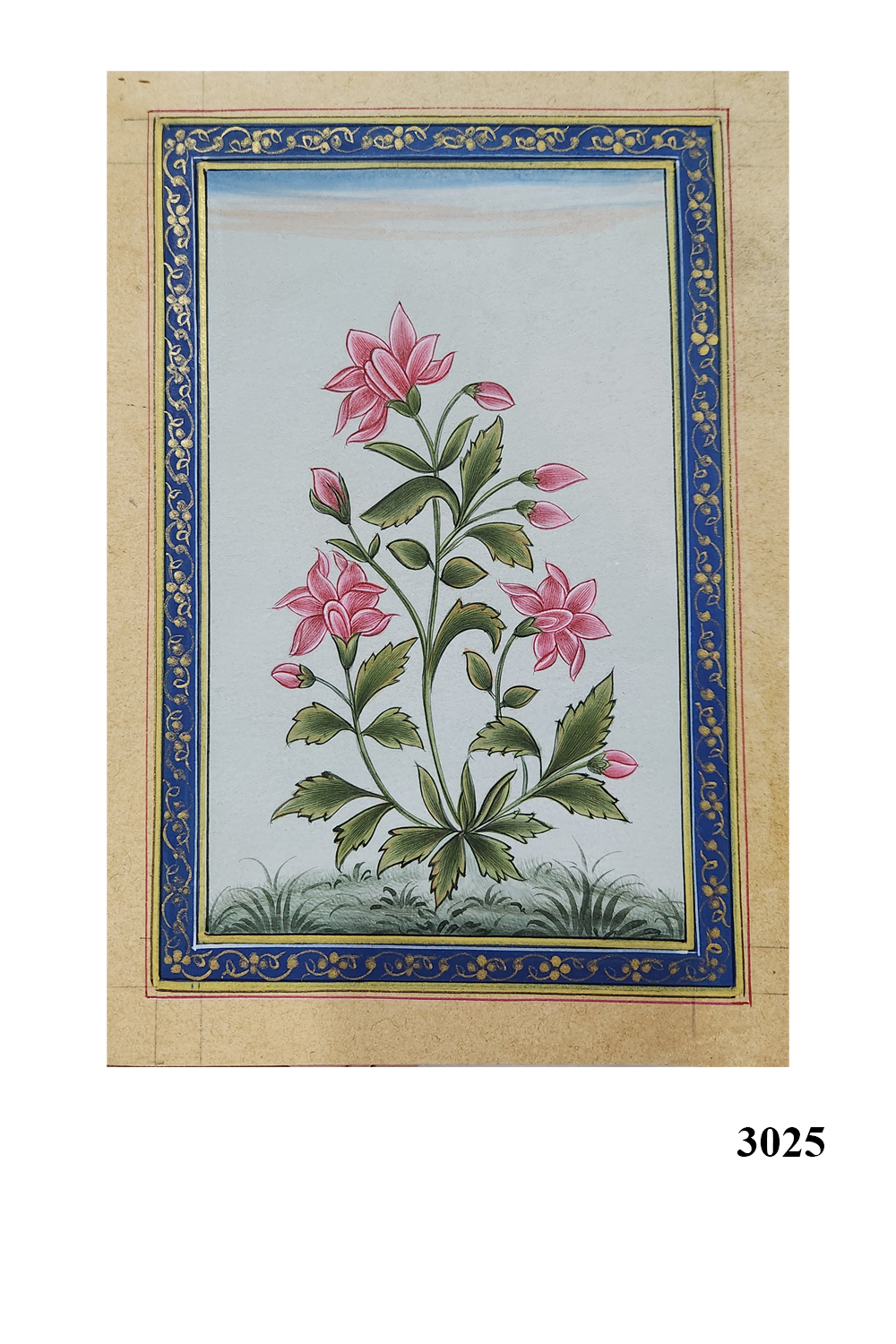 This exquisite miniature painting showcases a flowering plant with multiple pink blossoms and lush green leaves. The artwork is framed by an ornate blue and gold border, adding a touch of elegance and sophistication. The painting is characterized by: