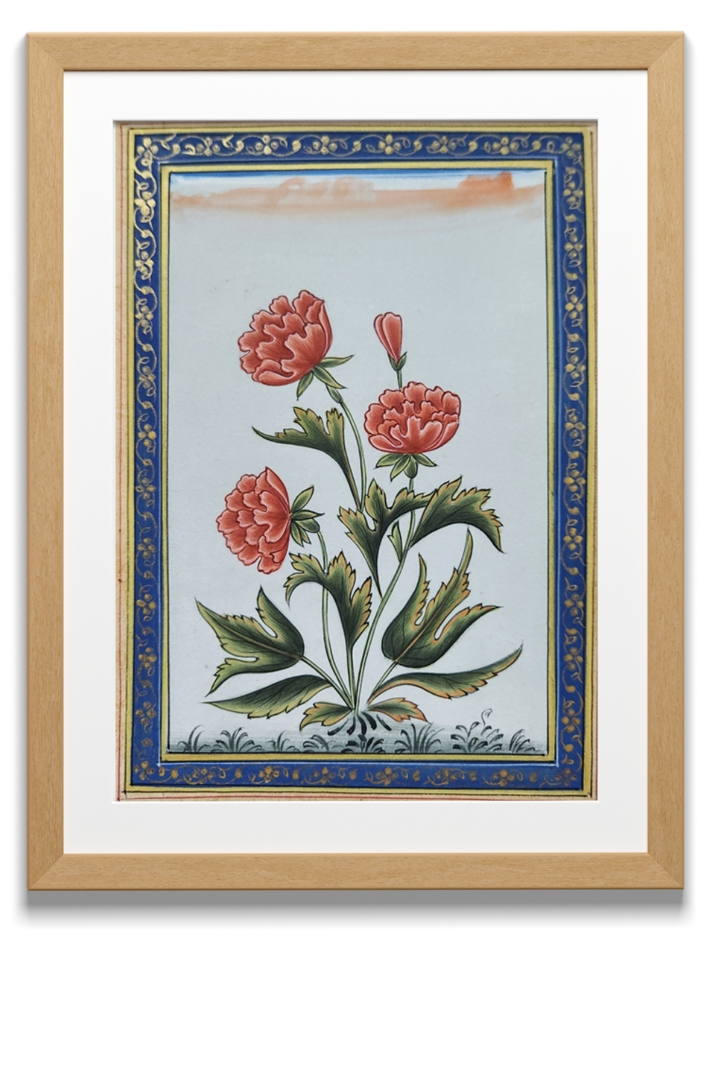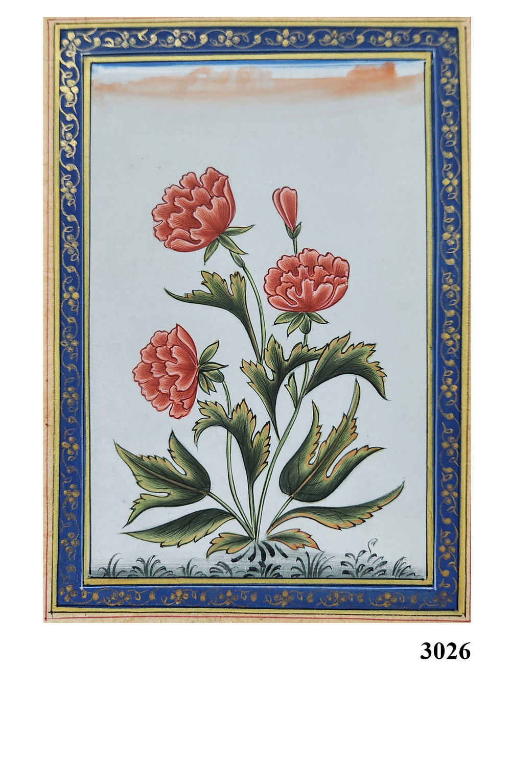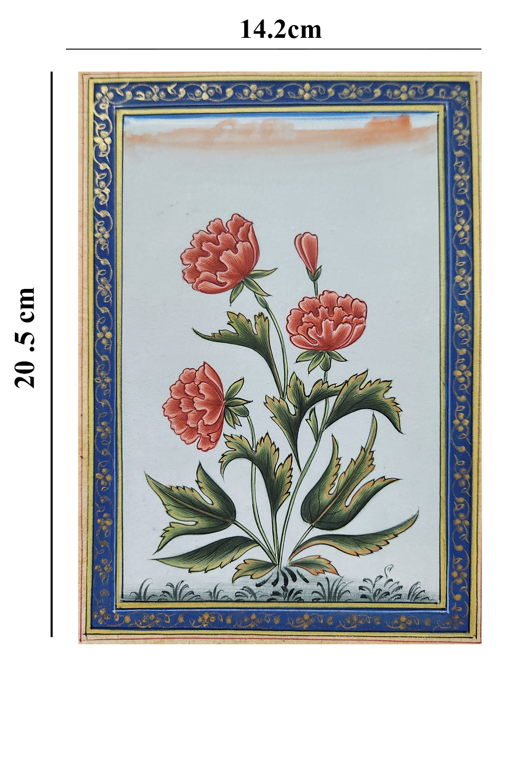 This exquisite miniature painting showcases a delicate arrangement of peonies, rendered in vibrant hues of red and green. The artwork is framed by an ornate blue and gold border, adding a touch of elegance and sophistication. The peonies are depicted with meticulous attention to detail, highlighting the intricate patterns of the petals and leaves. The background is kept minimal, allowing the flowers to stand out prominently. The painting is a fine example of traditional botanical art, capturing the beauty and grace of peonies in a timeless manner.