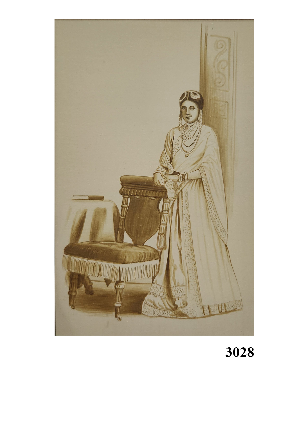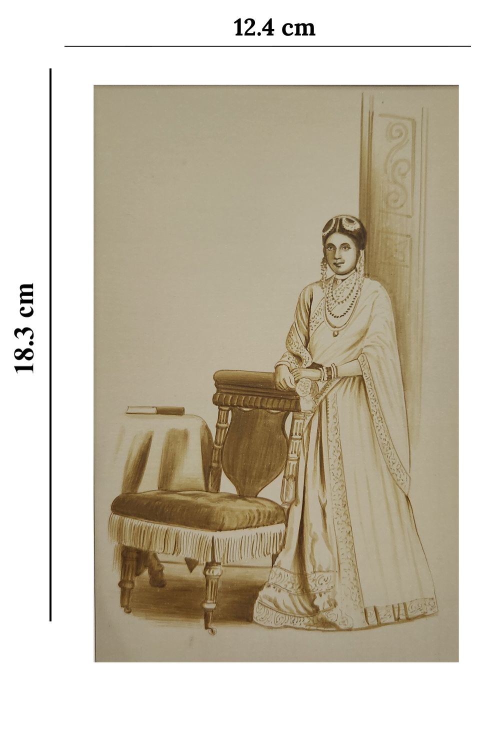 This exquisite sepia-toned watercolor painting captures the timeless elegance of a traditionally dressed figure standing beside an ornate chair and a table. The figure's face is intentionally obscured, directing focus towards the intricate details of the attire and surroundings. The painting features rich patterns on the clothing, layers of delicate jewelry, and carefully detailed furniture. A book placed on the table adds a touch of intellectual charm, while a decorative pillar in the background enhances the scene's classical ambiance.