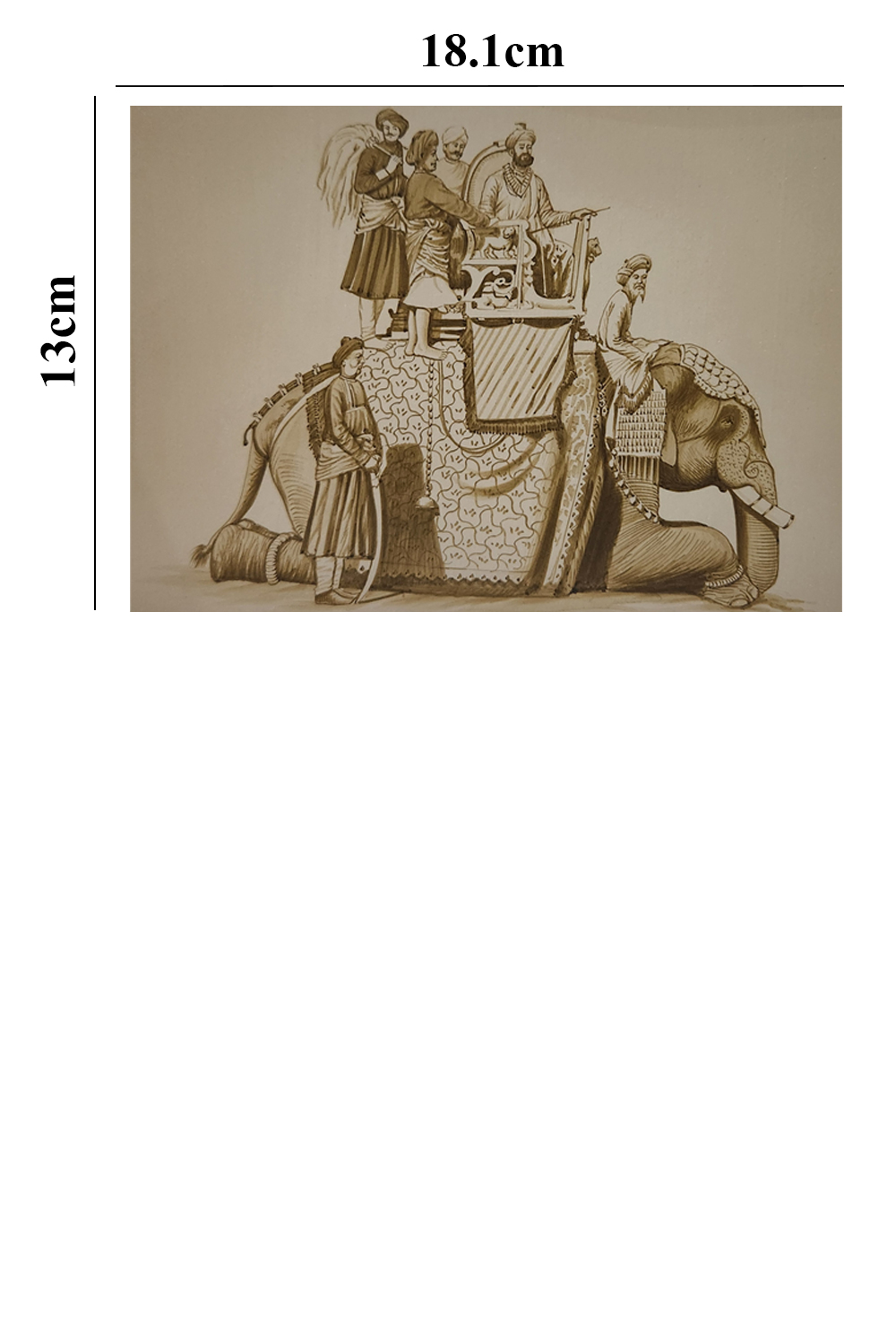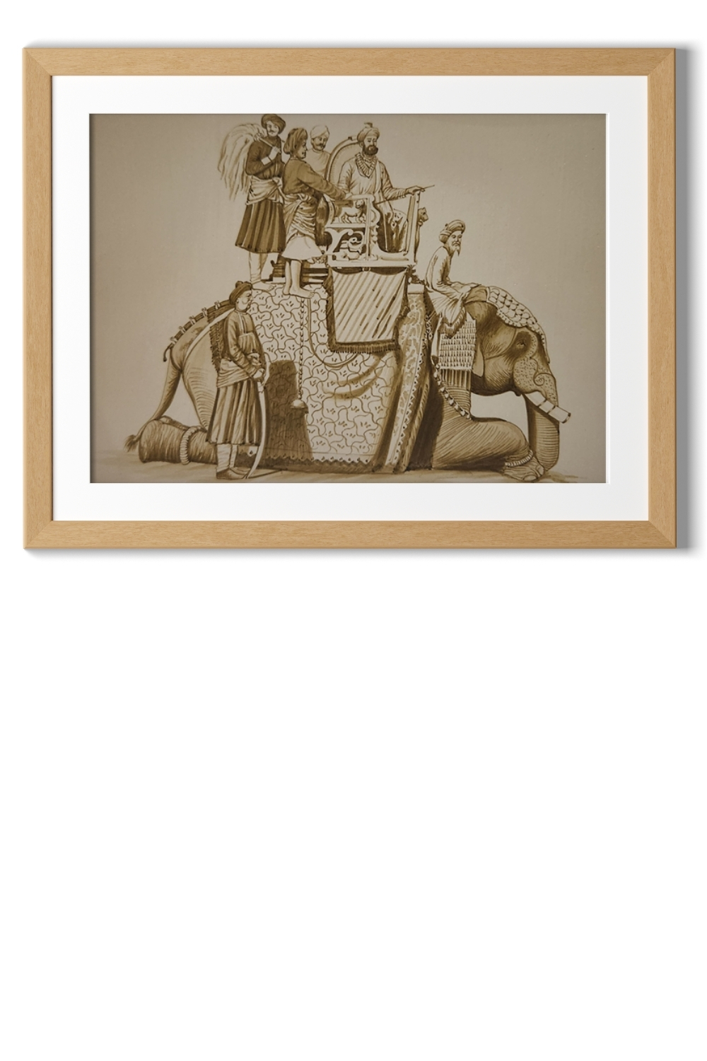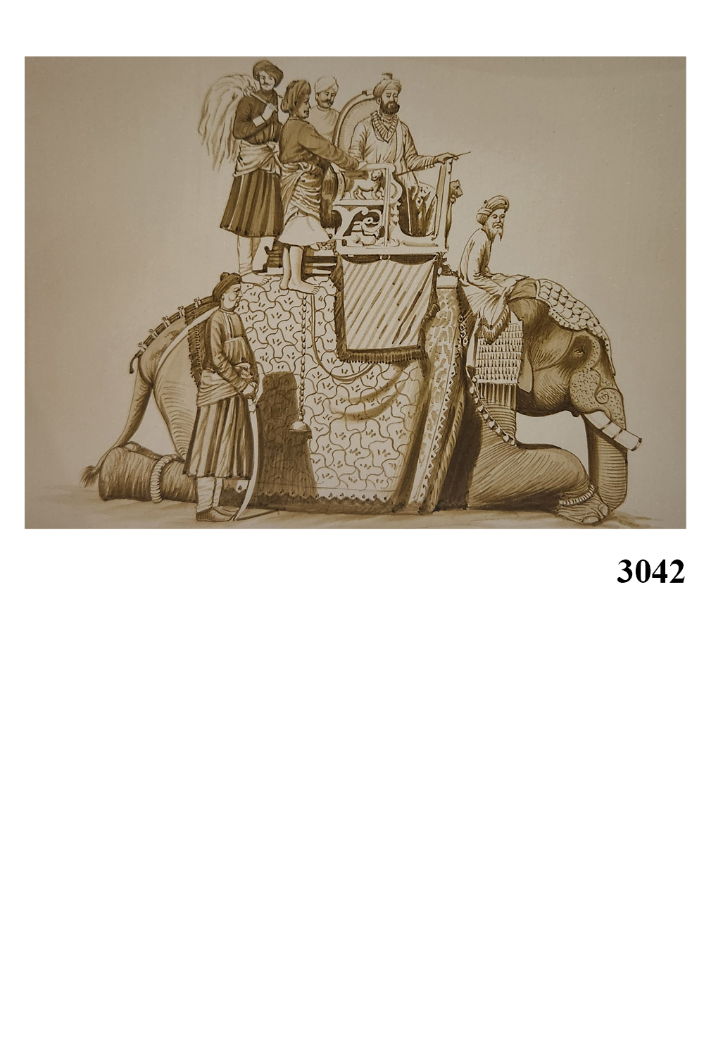 This sepia-toned watercolor painting captures the grandeur of a royal procession, with a majestic elephant adorned with intricate patterns and textiles as the centerpiece. The elephant is richly decorated with traditional attire and carries several figures, suggesting their noble or royal status. One figure is prominently seated in a throne-like seat, highlighting the importance of the procession. The detailed rendering of the elephant and the figures showcases the artist's skill in capturing both the grandeur and subtleties of the scene. The sepia tone gives the artwork a timeless and vintage quality, making it a captivating piece that evokes historical and cultural significance.