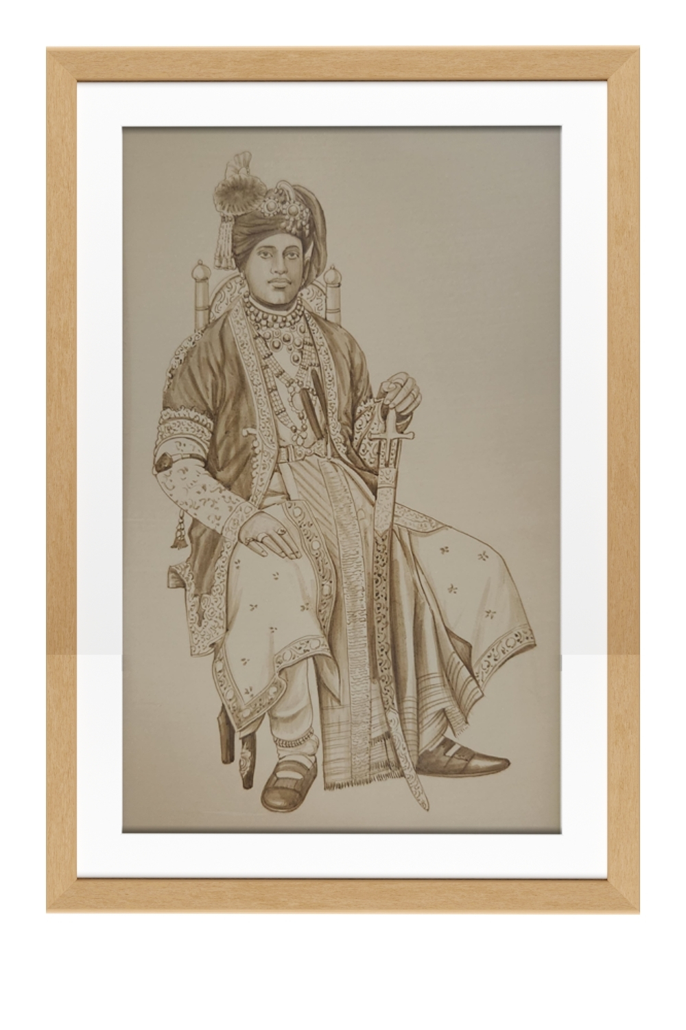A seated figure in traditional royal attire, exuding authority and grace.