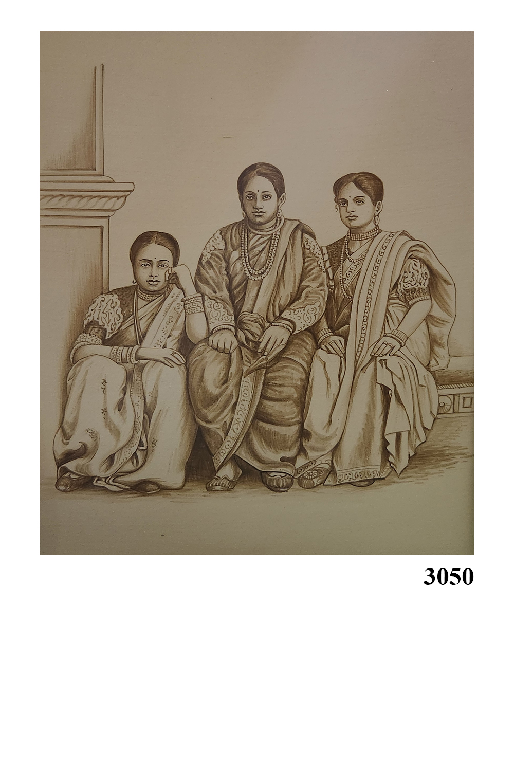 This sepia-toned artwork captures a moment of historical significance, featuring three individuals adorned in traditional attire. The painting is characterized by:
