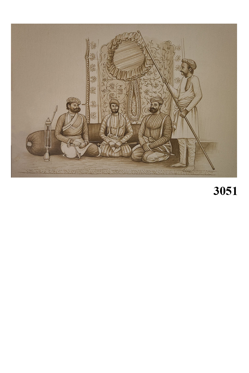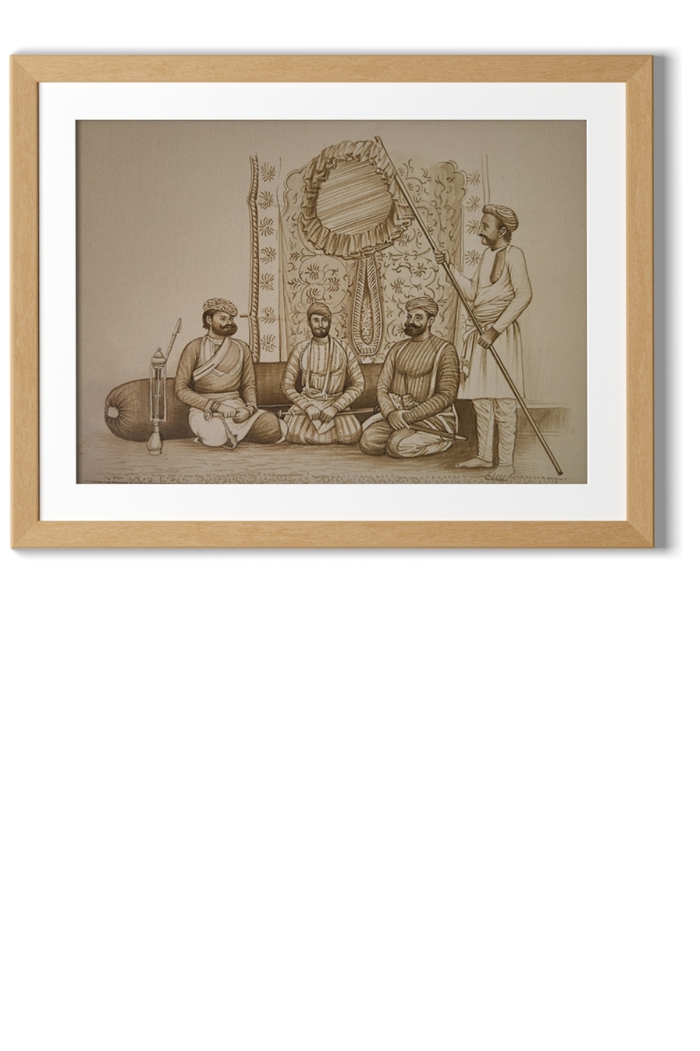This sepia-toned artwork captures a traditional scene featuring four individuals, three seated and one standing, against a backdrop adorned with intricate patterns and cultural artifacts. The painting is rich in detail and offers a glimpse into traditional attire and communal life. The seated figures are dressed in traditional clothing, while the standing individual holds a long staff, adding to the scene's historical significance. A large, ornate fan or ceremonial object hanging in the background enhances the cultural context. The detailed patterns and traditional musical instruments placed beside one of the seated individuals further add to the richness of the scene.