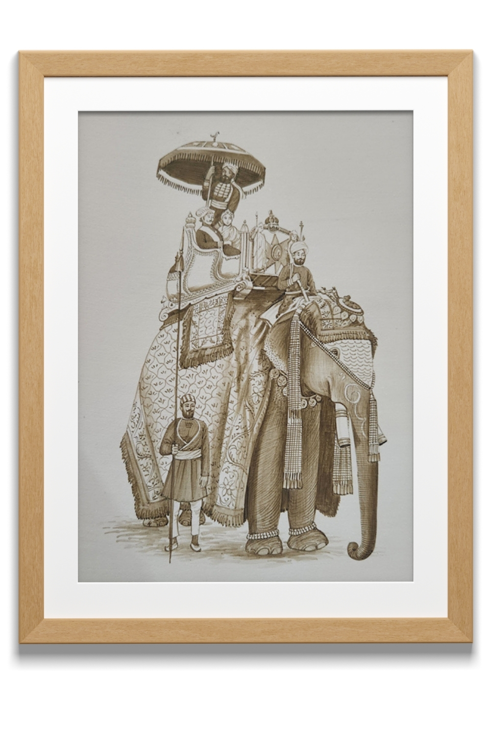 This sepia-tone artwork captures a majestic scene of a royal procession featuring: