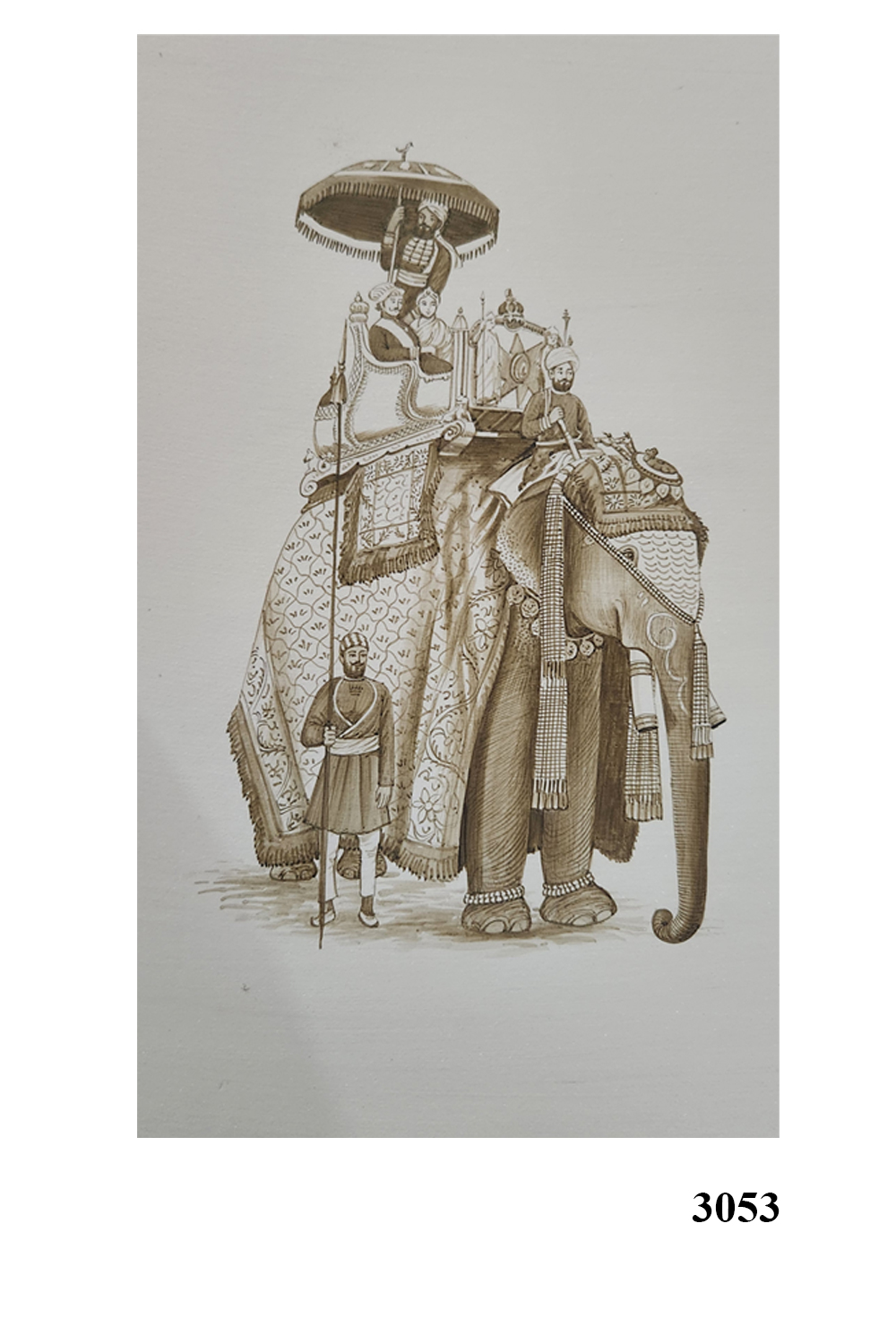 Regal figure: Seated on a high, ornate howdah (elephant saddle) under a decorative umbrella.