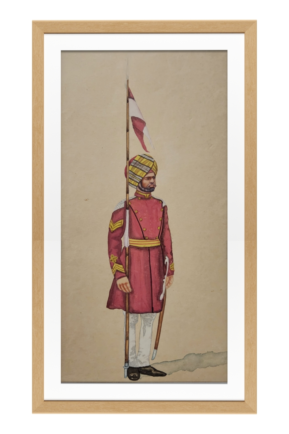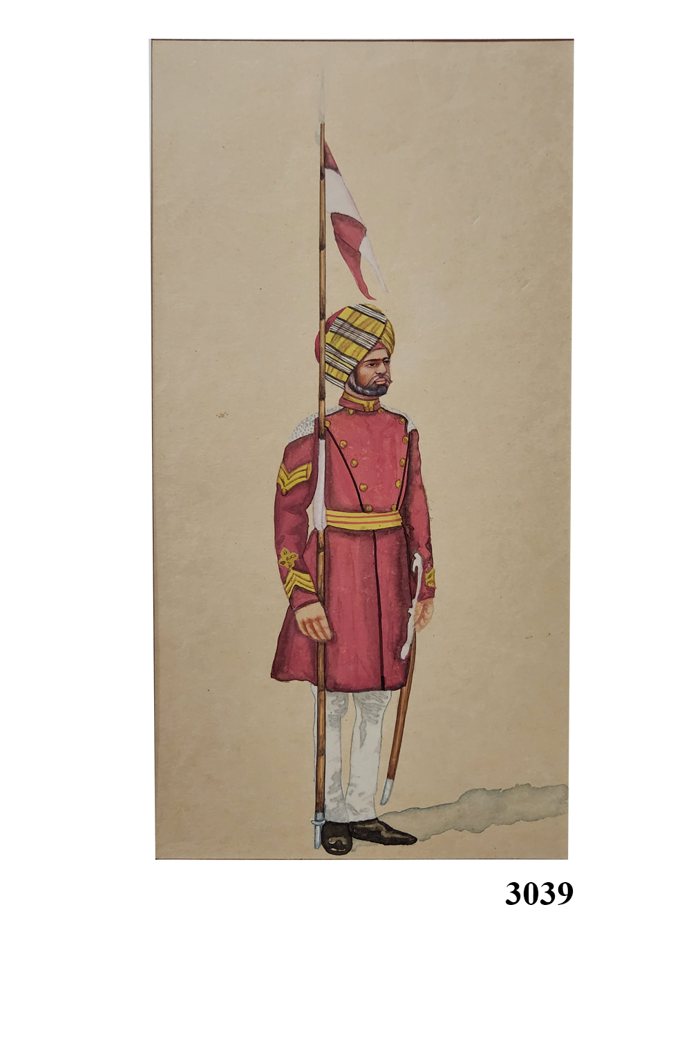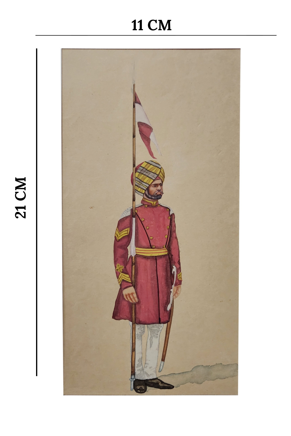 This watercolor painting captures the elegance and discipline of a ceremonial guard dressed in a traditional uniform. The guard is depicted standing upright, holding a flag with a red and white design. The uniform is predominantly red with gold accents, including epaulets, buttons, and decorative patterns on the sleeves. The guard wears a matching helmet with gold detailing and a white plume. The painting is rendered with meticulous attention to detail, highlighting the textures and colors of the uniform and flag. The background is kept minimal, focusing attention on the guard.