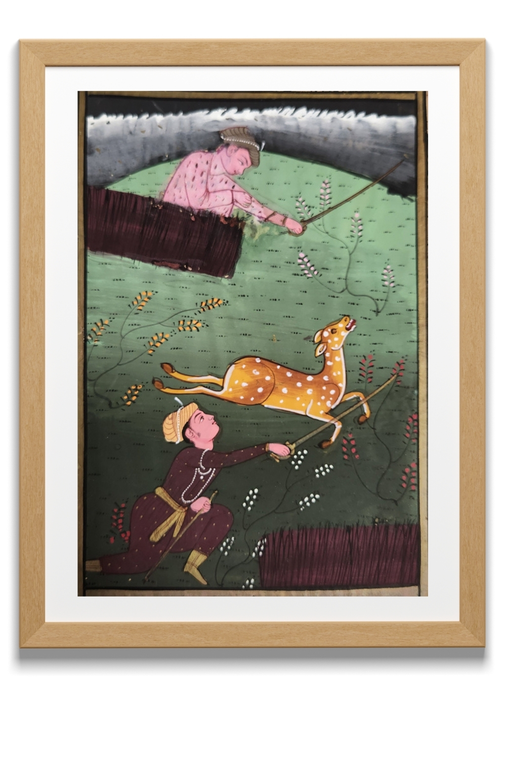 This miniature painting captures a dynamic hunting scene with intricate details and vibrant colors. The painting features: