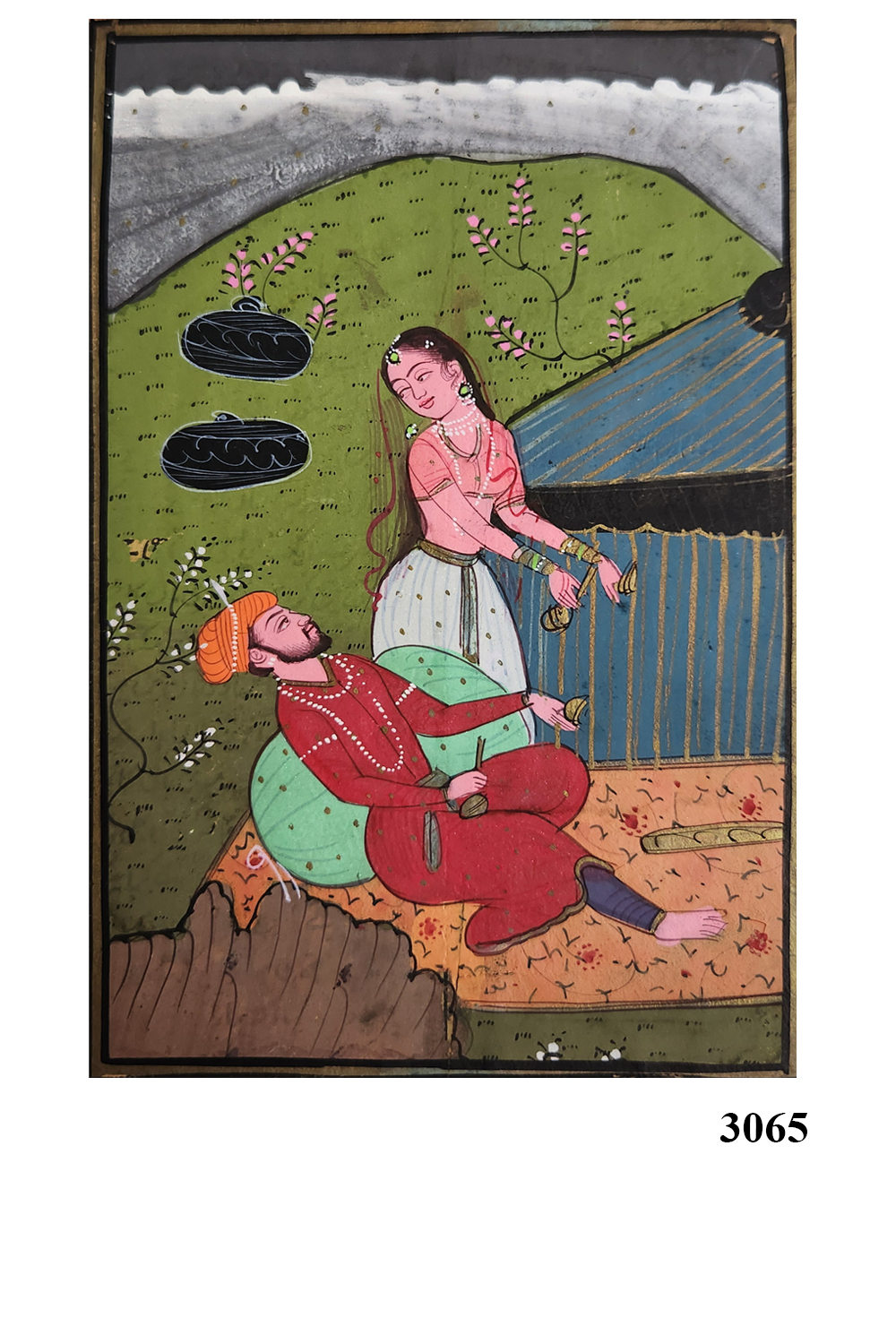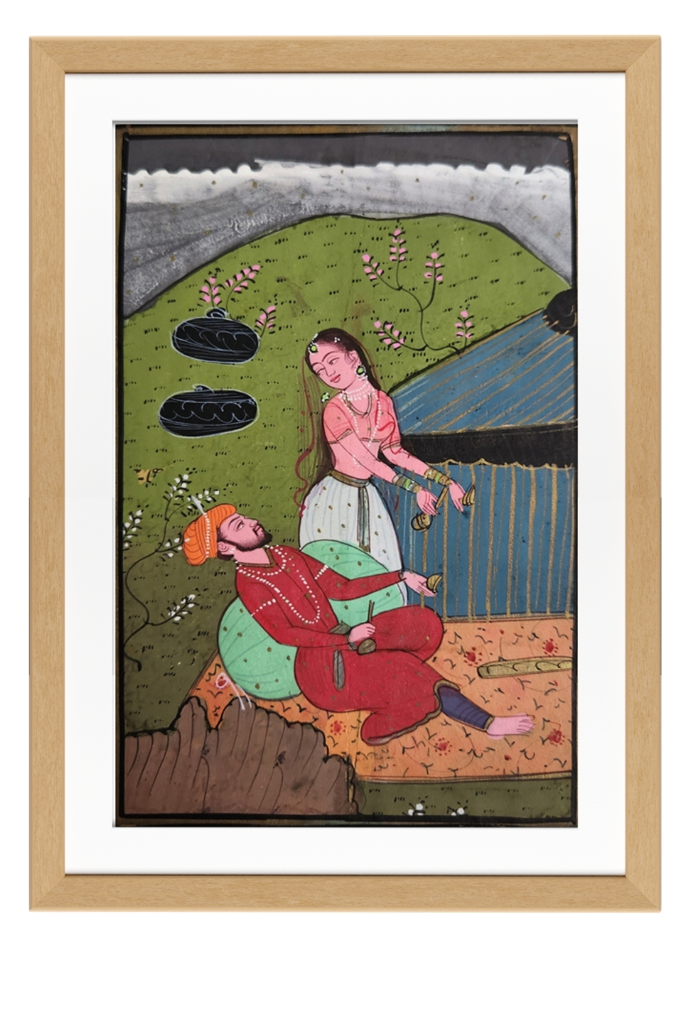 This exquisite miniature painting captures a tranquil moment in a verdant, hilly setting. The artwork features: