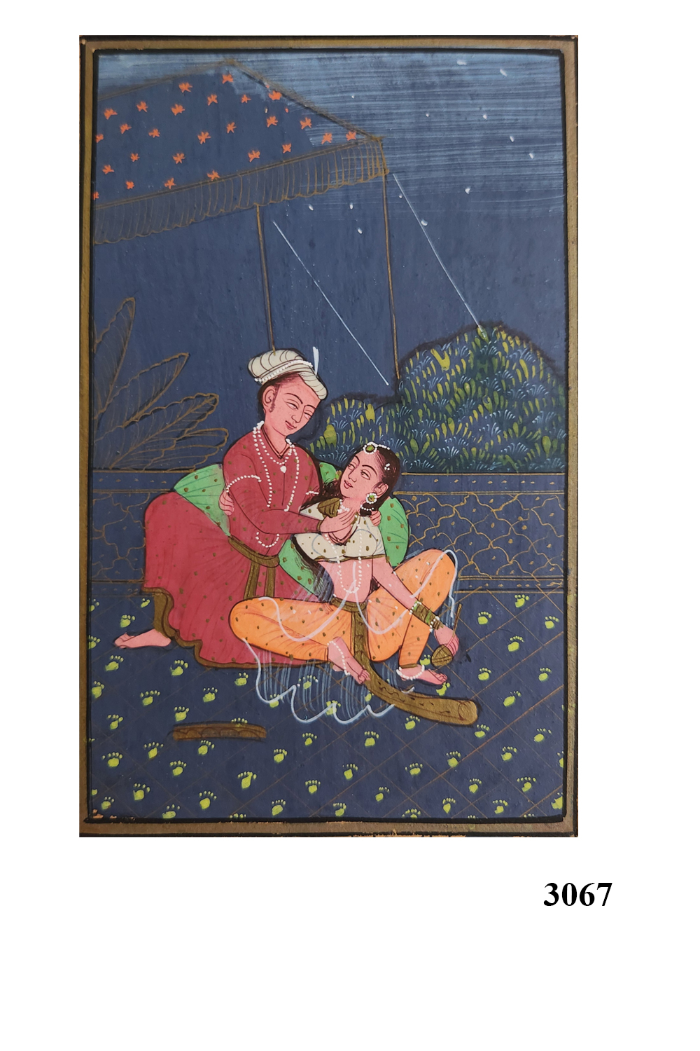 This miniature painting captures a serene and intimate scene of a royal figure and a child seated together under a starry night sky. The artwork is rich in detail and color, showcasing traditional attire and a lush background. Key features include: