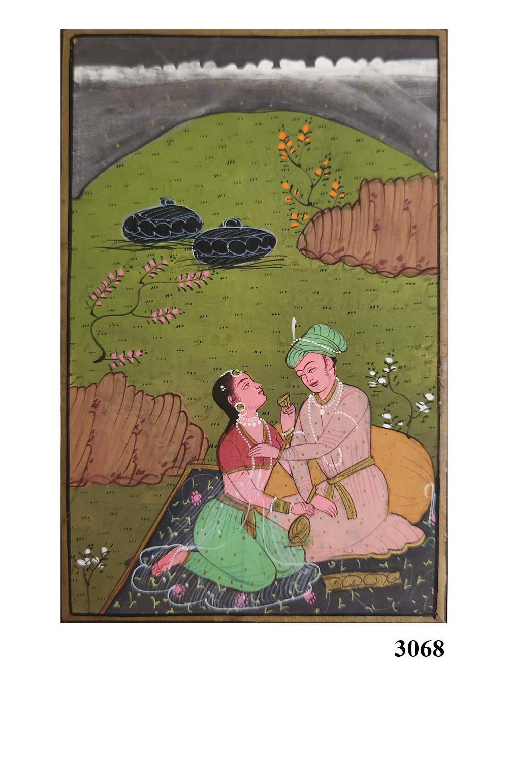 This exquisite miniature painting captures a serene and intimate scene of a royal couple seated on a mat in a verdant garden. The painting features: