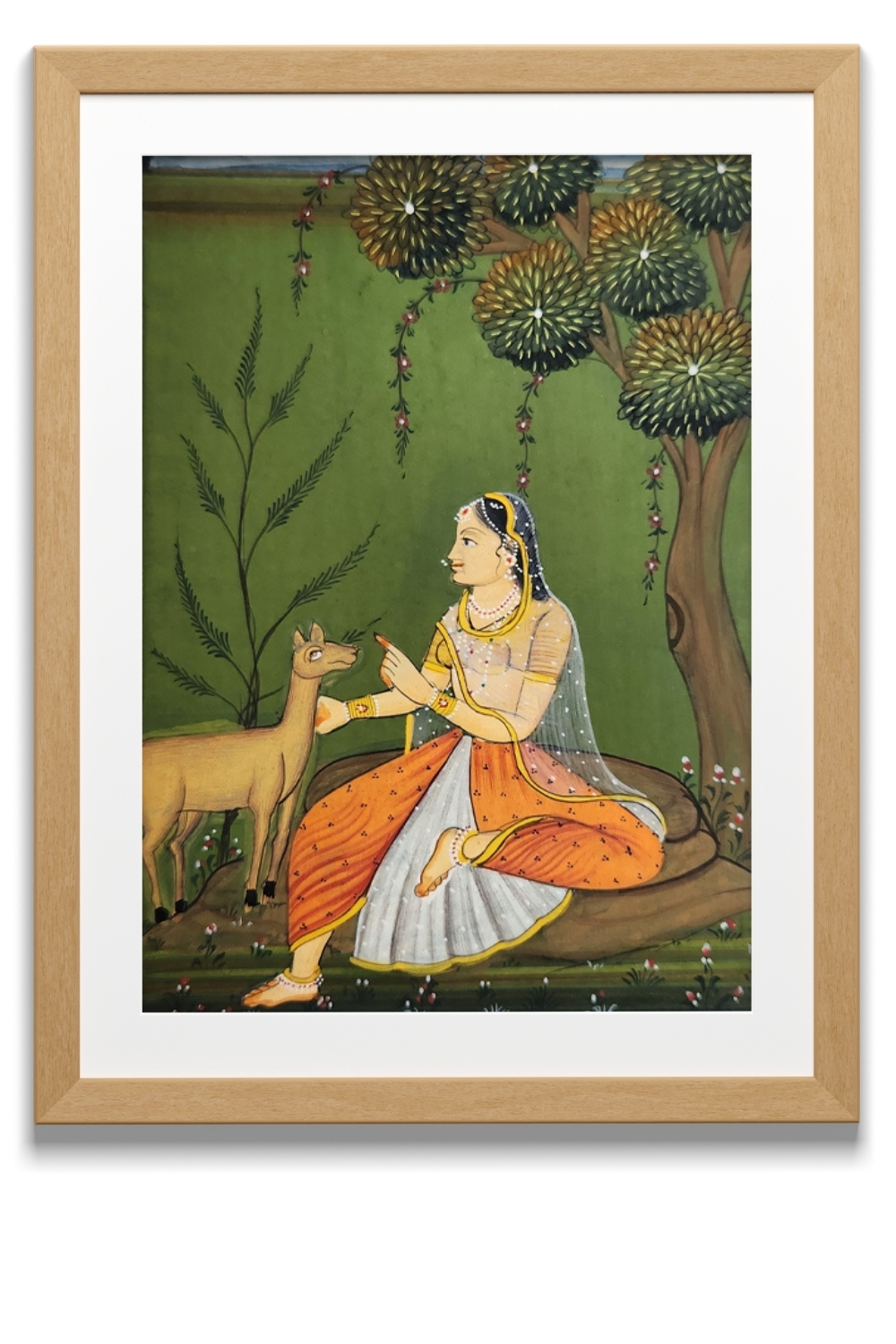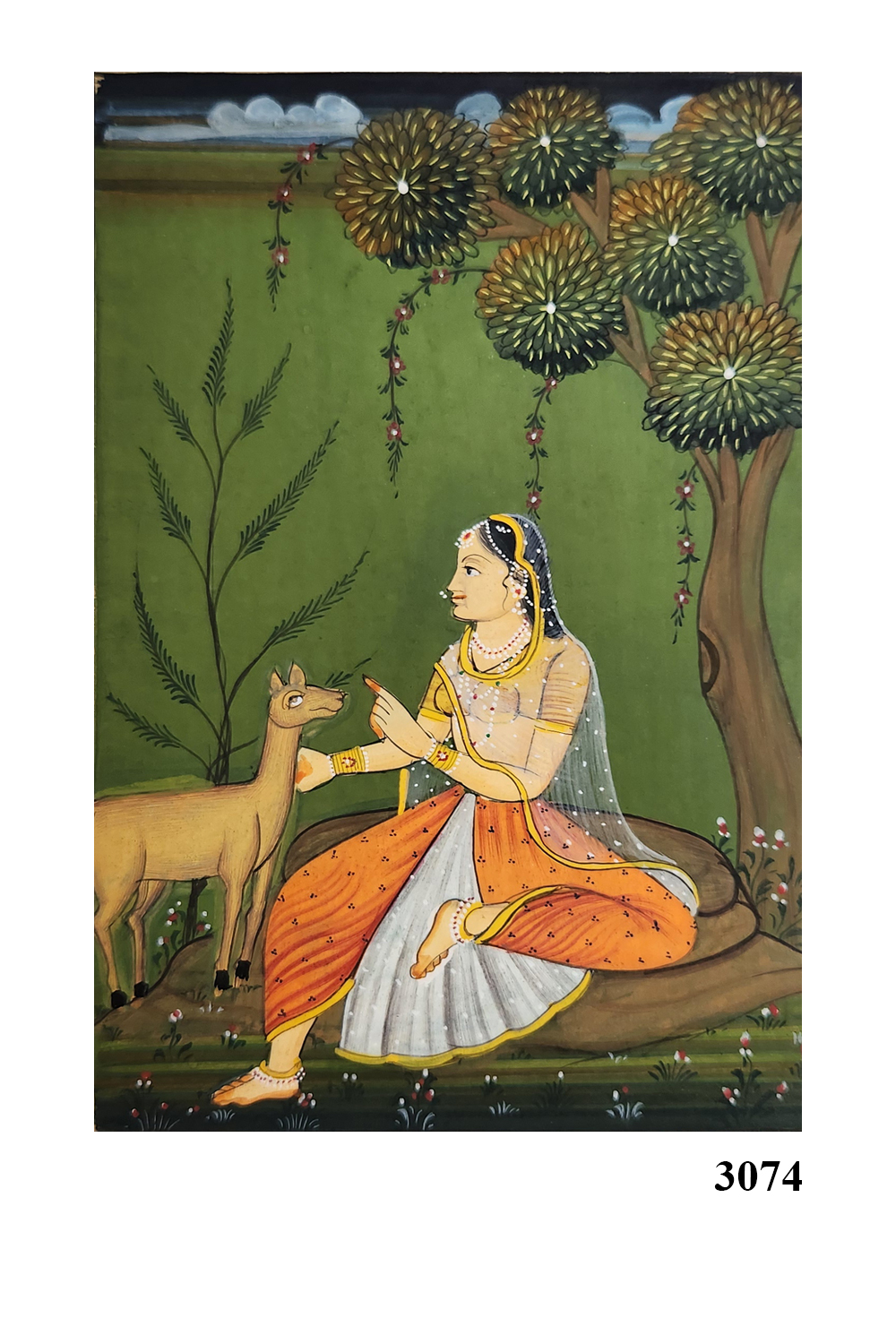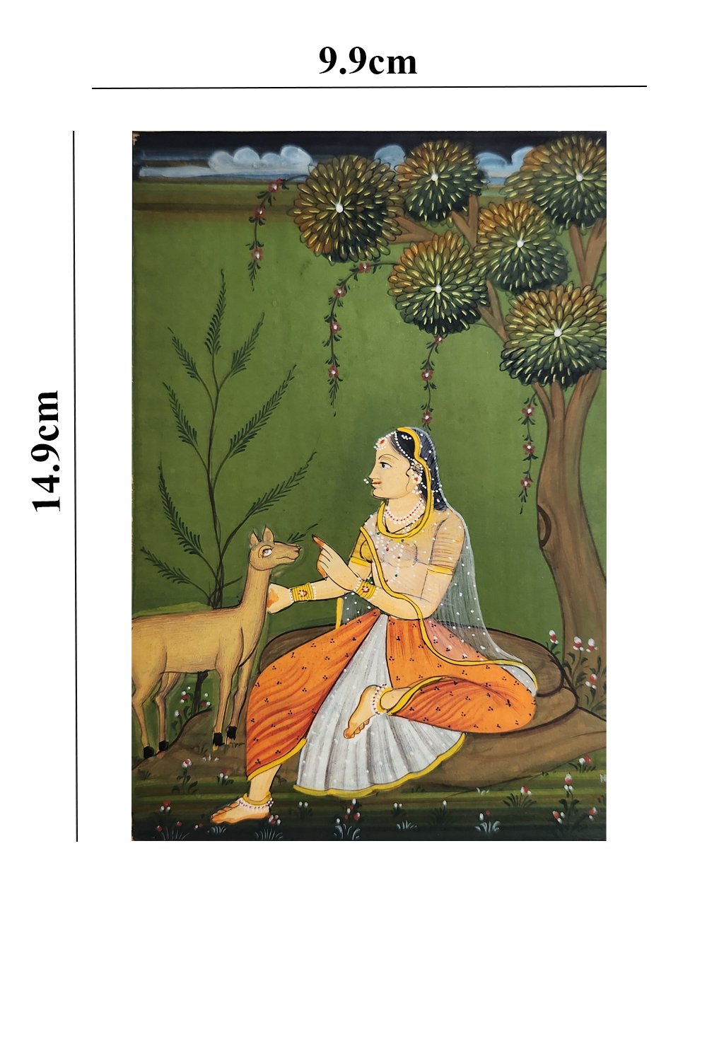 This exquisite miniature painting captures a serene moment where a lady, adorned in traditional attire, is seen gently interacting with a deer. The painting is set against a lush green garden backdrop, featuring detailed foliage and flowering trees. The lady's attire is intricately designed with vibrant colors and delicate patterns, showcasing the artist's attention to detail. The deer, standing close to the lady, adds a touch of innocence and harmony to the scene. The use of earthy tones and the meticulous brushwork highlight the traditional artistic techniques employed in this piece.