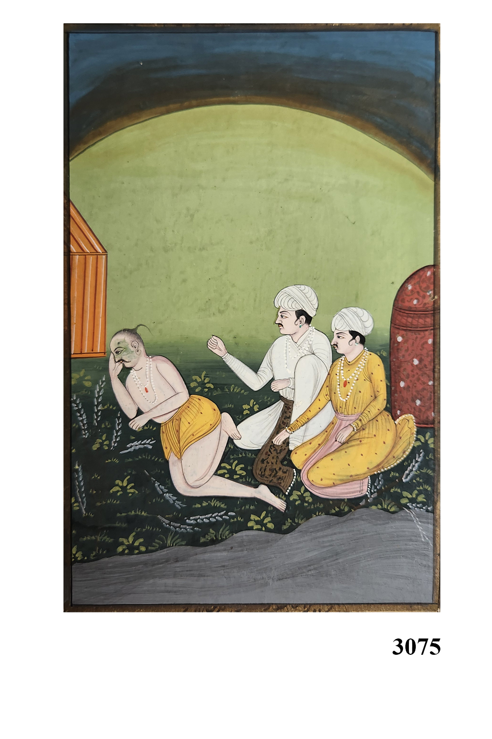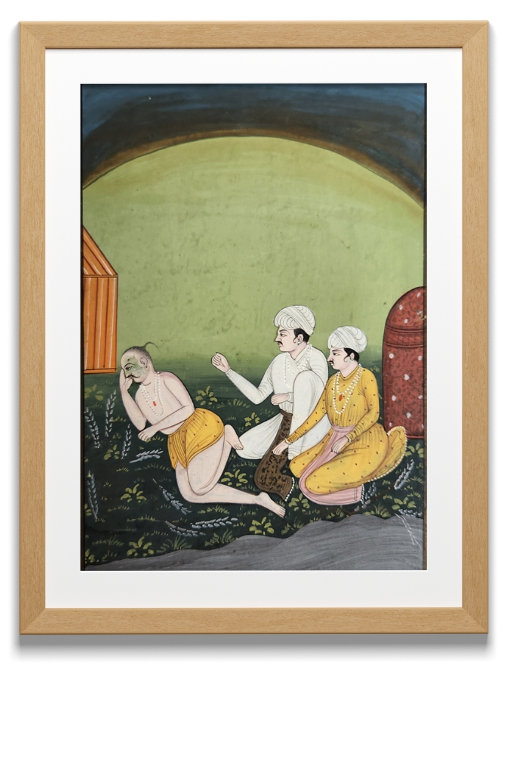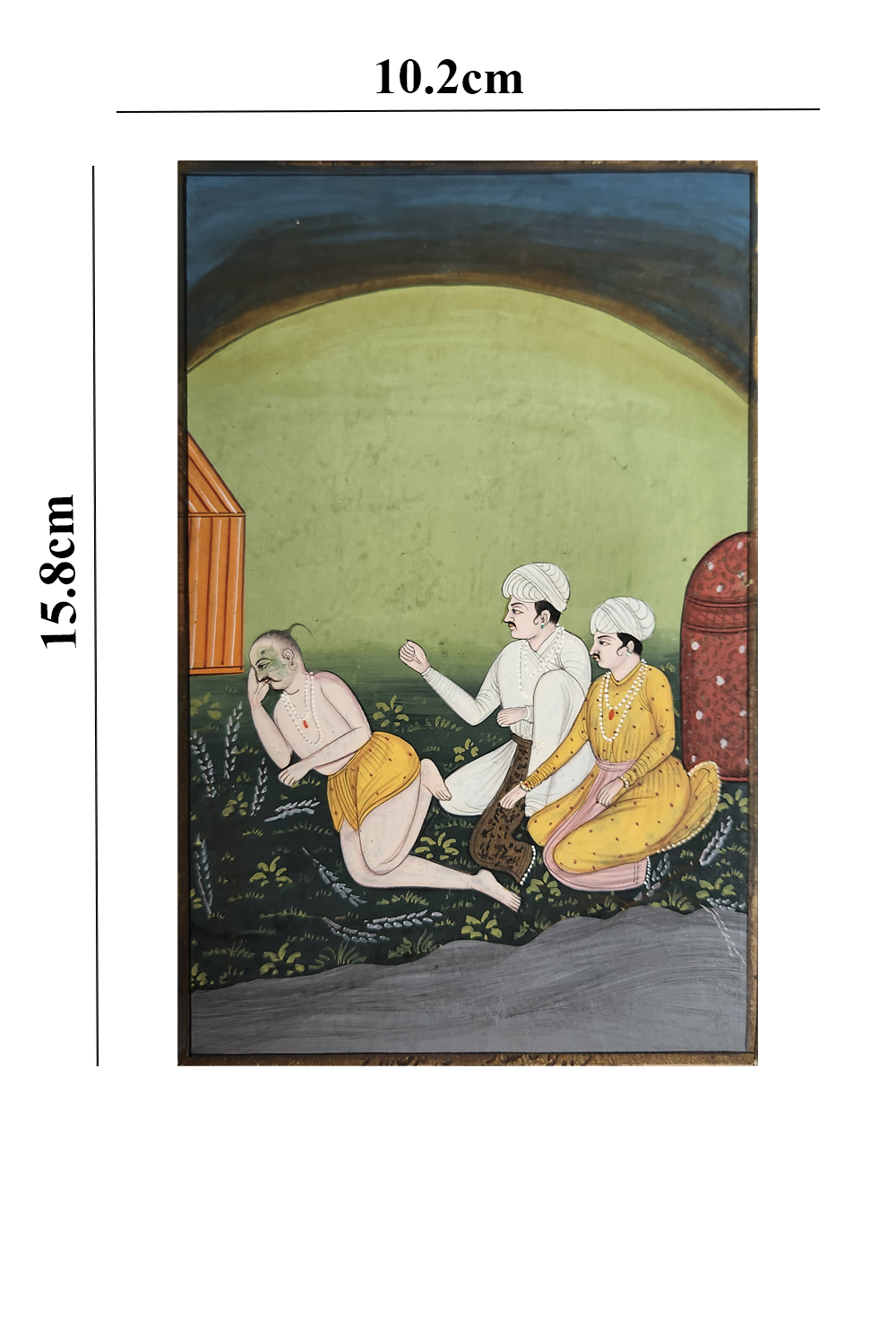"Dreams of the Brahman" is a captivating miniature painting that transports the viewer to a tranquil moment of repose. The scene depicts a Brahman peacefully sleeping under the shade, while two kings stand nearby, symbolizing reverence and protection. The artwork beautifully captures the delicate balance between spirituality and royalty, with intricate details that bring the characters to life.