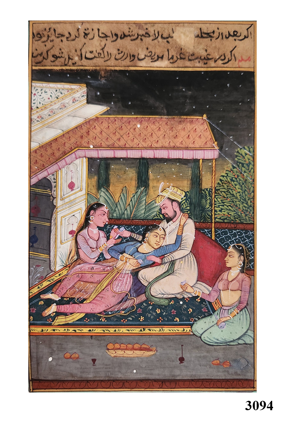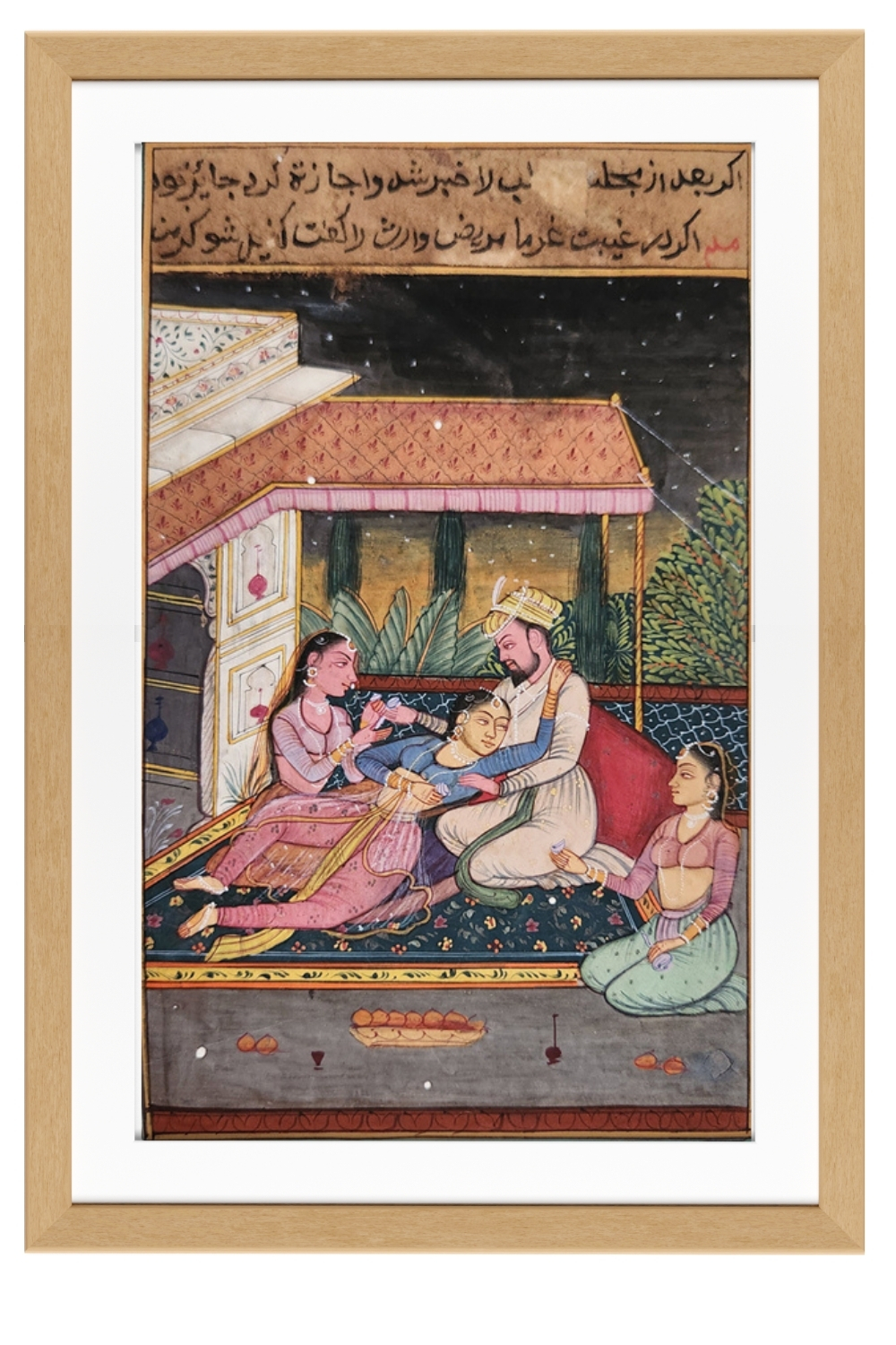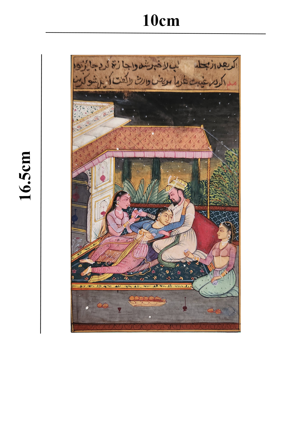 This exquisite miniature painting portrays a serene royal court scene, capturing the essence of regal life. The central figure, likely a king or noble, is seated on a cushioned platform under a richly decorated canopy. Two attendants, dressed in vibrant traditional attire, are seen attending to the central figure. The background features lush greenery, adding depth and tranquility to the scene. The intricate detailing of the clothing, the canopy, and the surrounding elements highlight the artist's meticulous craftsmanship. The painting is bordered with a script, possibly in Persian, adding a historical and cultural context to the artwork.