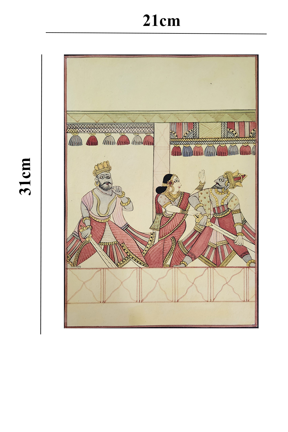 This painting, titled "Royal Court Scene," is a fine example of traditional Indian art, showcasing a moment of interaction within a royal court. The artwork features: