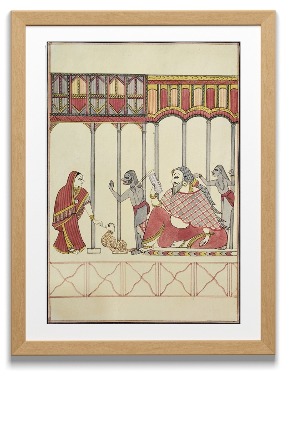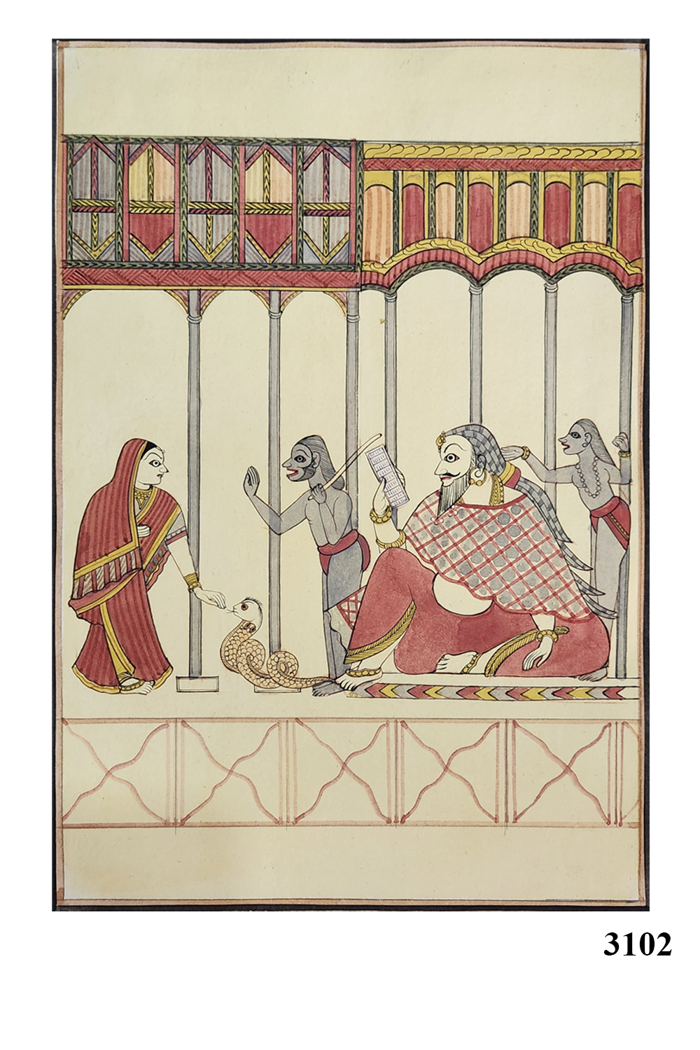 This Indian School painting illustrates a vivid royal scene. The king, seated on a platform, is attended by two servants, one of whom is holding a fan. A woman, dressed in traditional attire, stands before the king, presenting a snake. The architectural elements in the background, with their intricate designs and vibrant colors, add depth to the scene. The painting showcases: