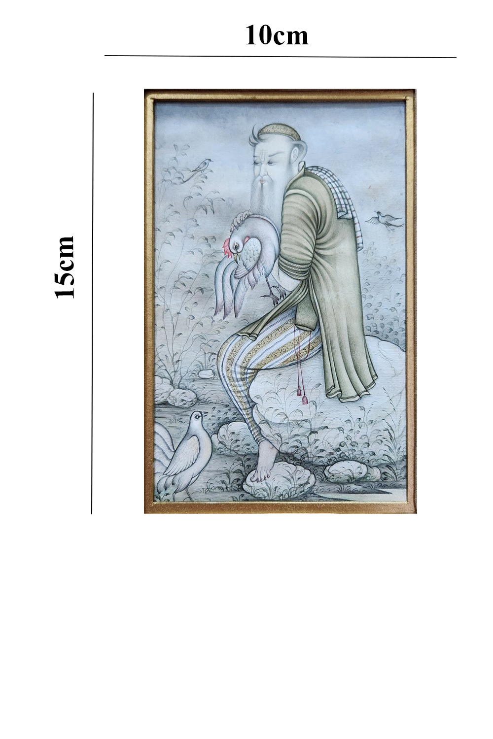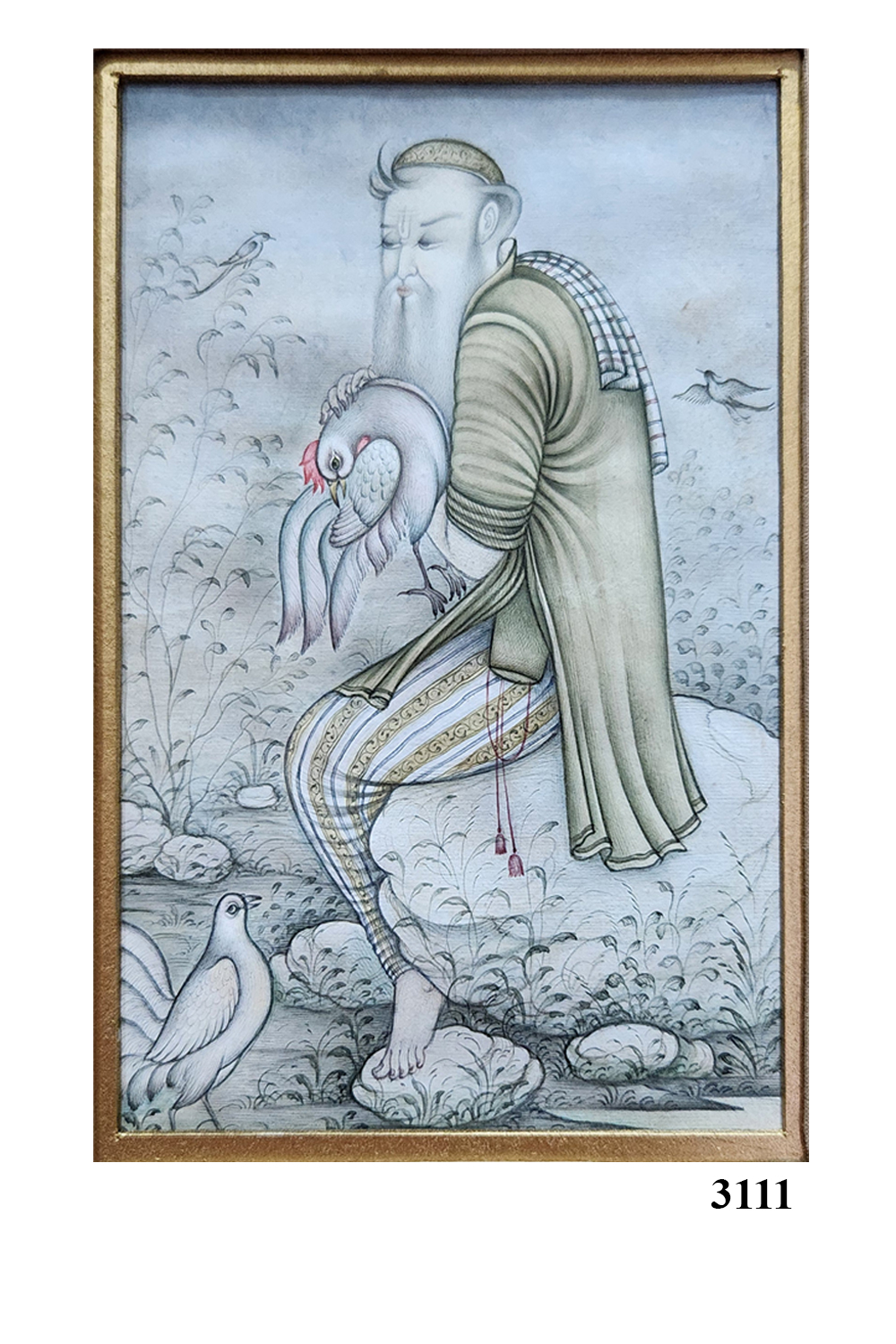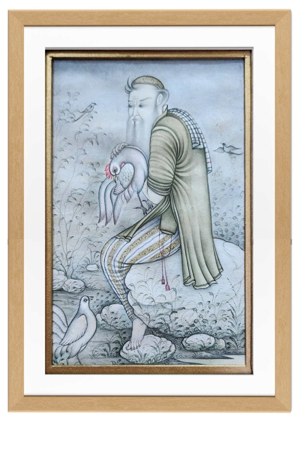 This painting, titled "The Bird Keeper," is a fine example of Indian miniature art. It features a figure seated on a rock, gently holding a bird with a tender expression. The background is filled with delicate foliage and additional birds, creating a tranquil natural setting. The figure is adorned in traditional attire with intricate patterns, and the use of soft, muted colors adds to the painting's calming effect. The attention to detail in the clothing, the feathers of the birds, and the surrounding flora showcases the artist's skill and dedication to the craft.