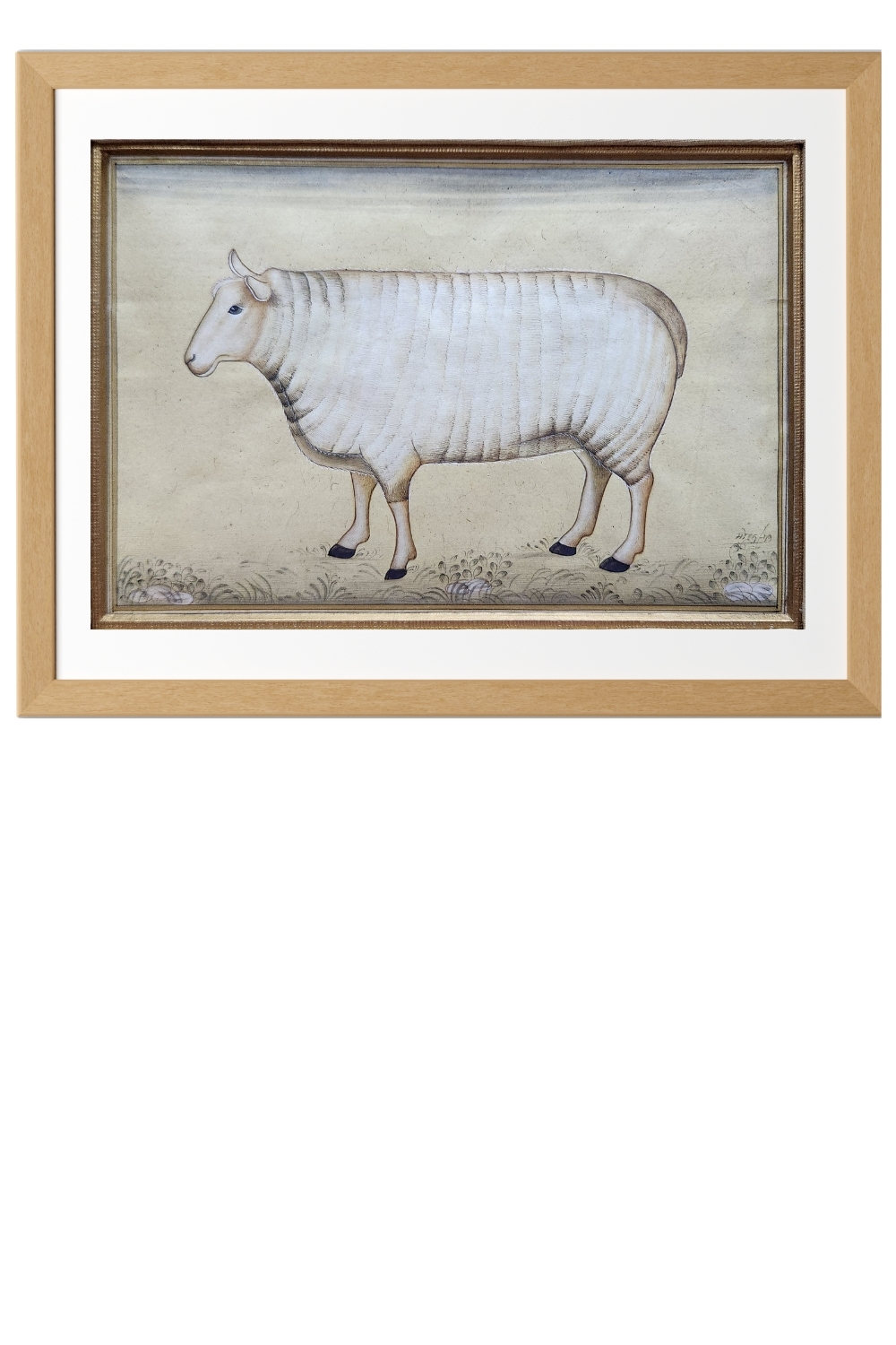 This exquisite miniature painting, titled "The Majestic Sheep," captures the serene and dignified presence of a sheep in a pastoral setting. The painting is characterized by: