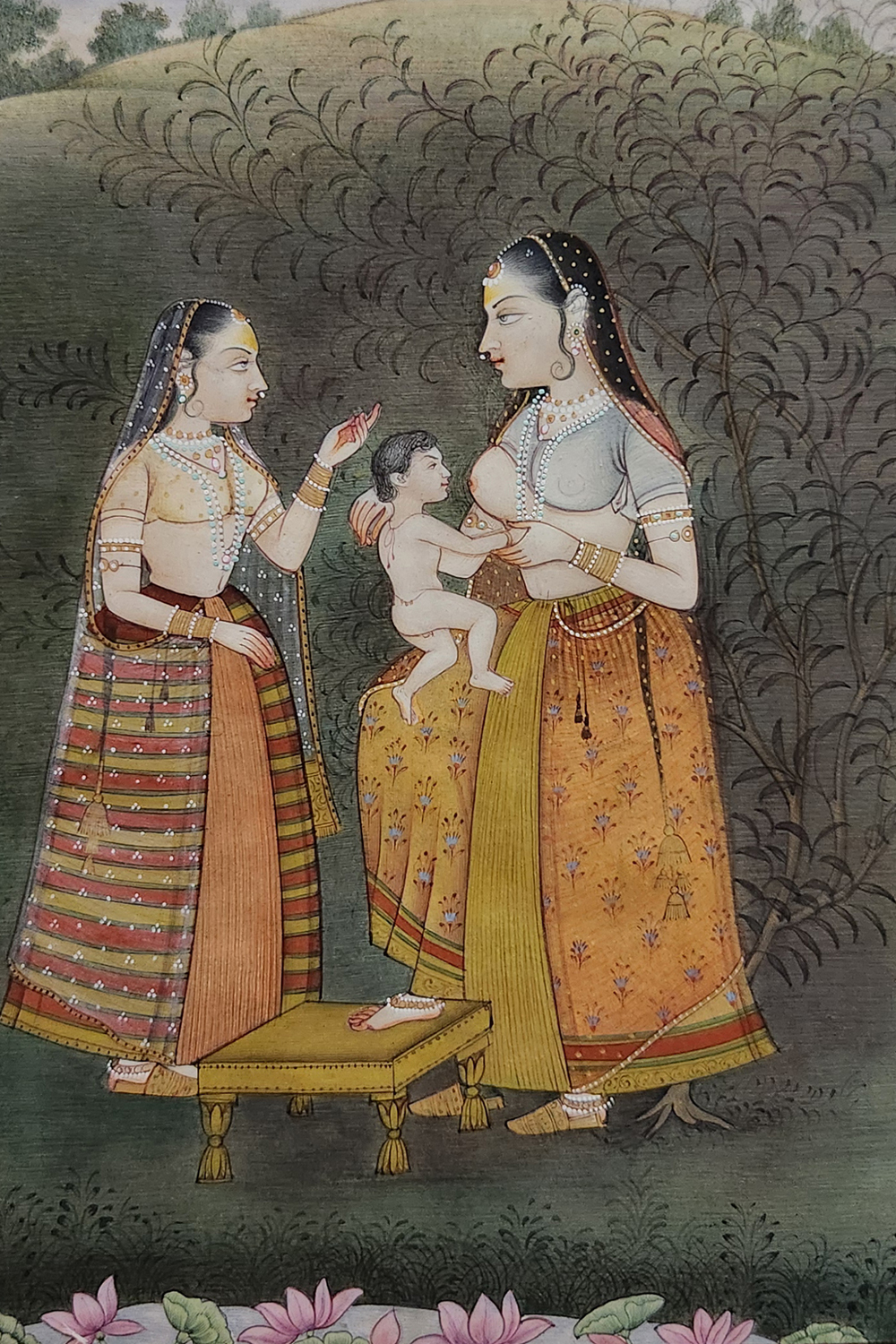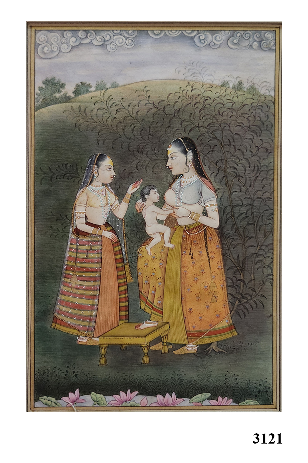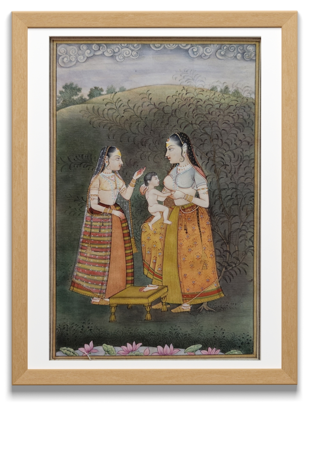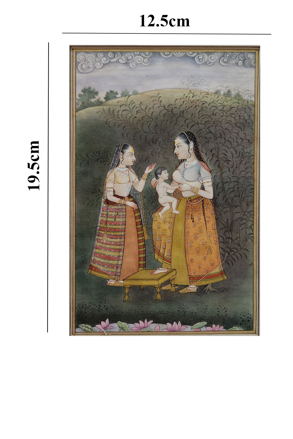 This exquisite Mughal miniature painting captures a serene moment of royal motherhood. The painting features: