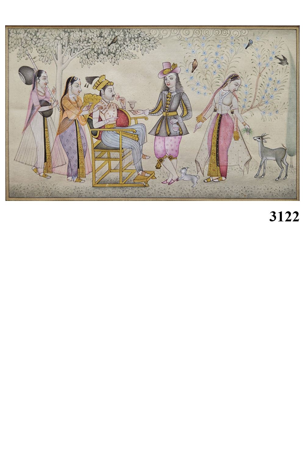 This exquisite miniature painting captures a serene royal court scene, showcasing the opulence and elegance of the era. The painting features: