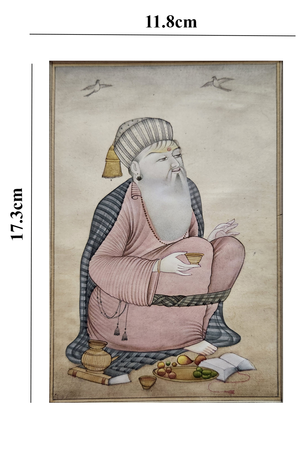 This exquisite miniature painting portrays a sage seated in a contemplative pose, holding a cup. The sage is adorned in a pink robe with intricate patterns and a striped shawl draped over the shoulders. The background is minimalistic with two birds flying, adding a serene ambiance. The sage is surrounded by various objects, including a book, fruits, and a vessel, symbolizing knowledge and sustenance. The painting is rich in detail and captures the essence of tranquility and wisdom.