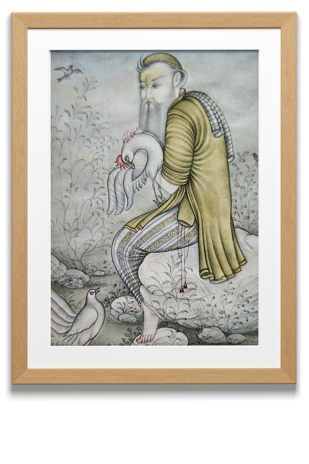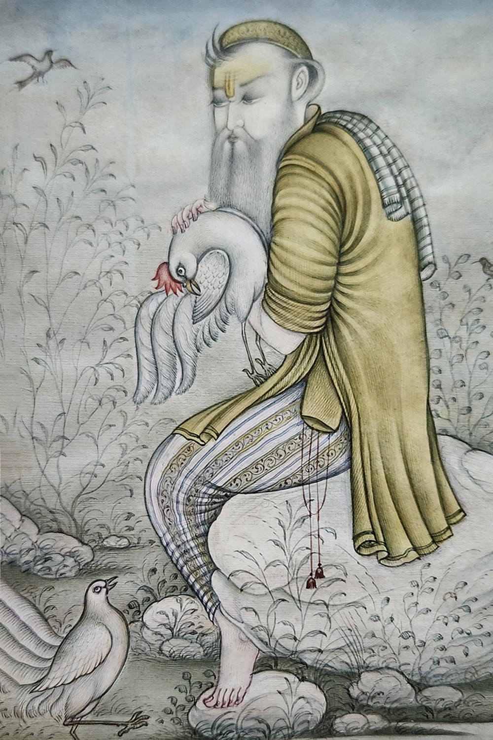 This exquisite miniature painting captures a tranquil scene where a figure is seated on a rock, tenderly holding a swan. The painting is rich in detail and features: