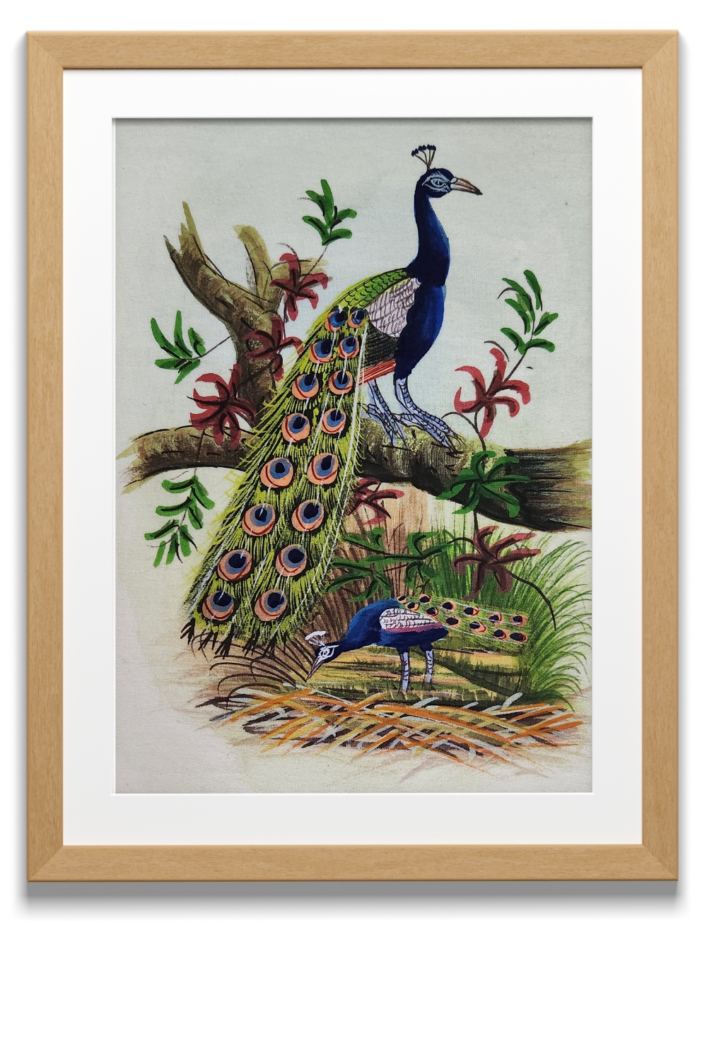 This exquisite water painting captures the elegance of two peacocks in a natural setting. The painting features: