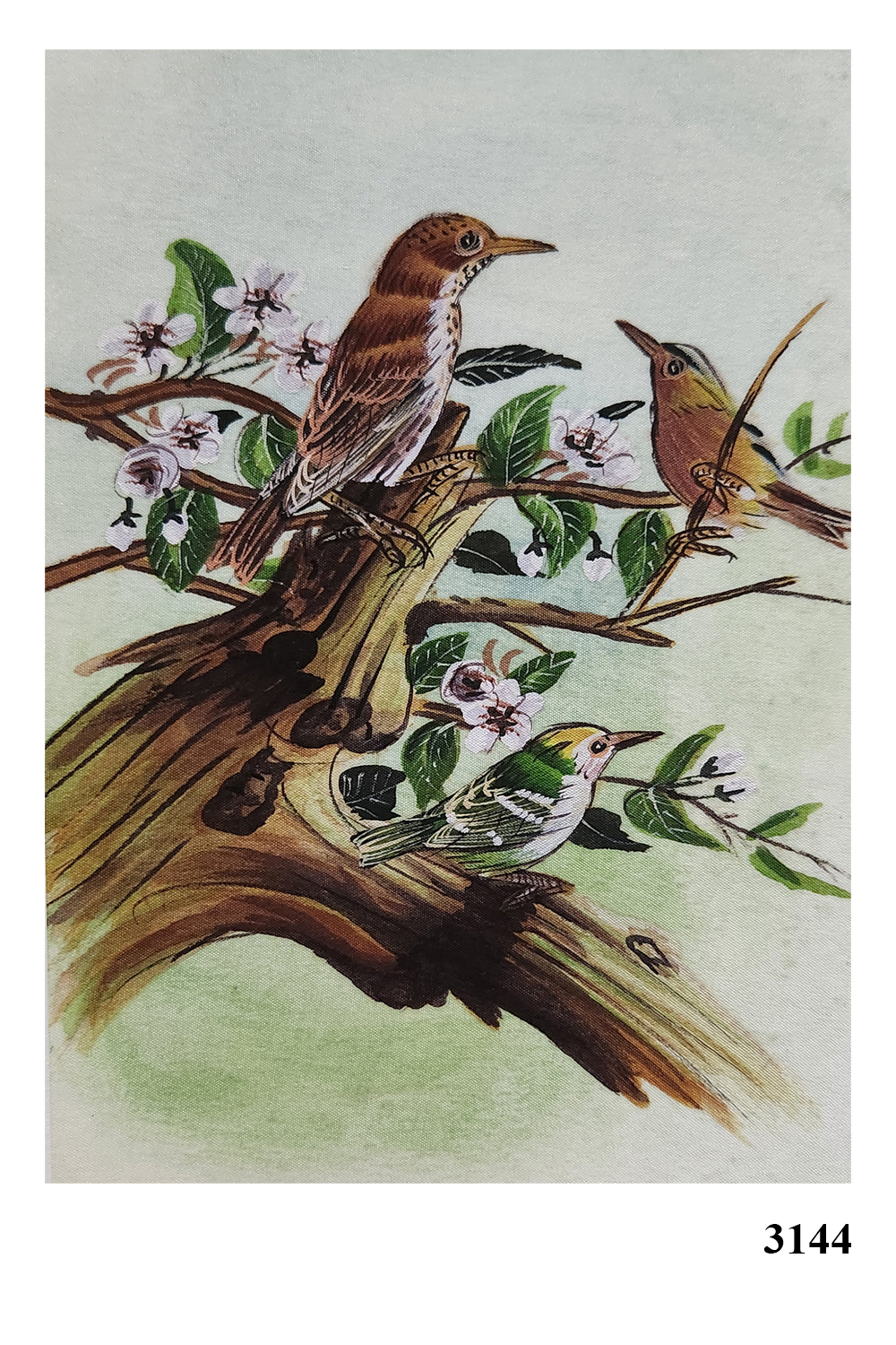 This watercolor painting captures a tranquil scene of nature with three birds resting on a flowering tree branch. The painting is characterized by:
