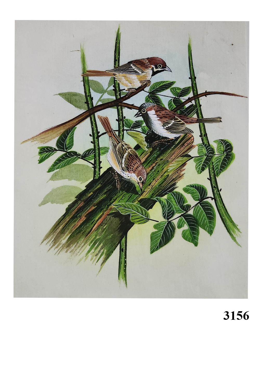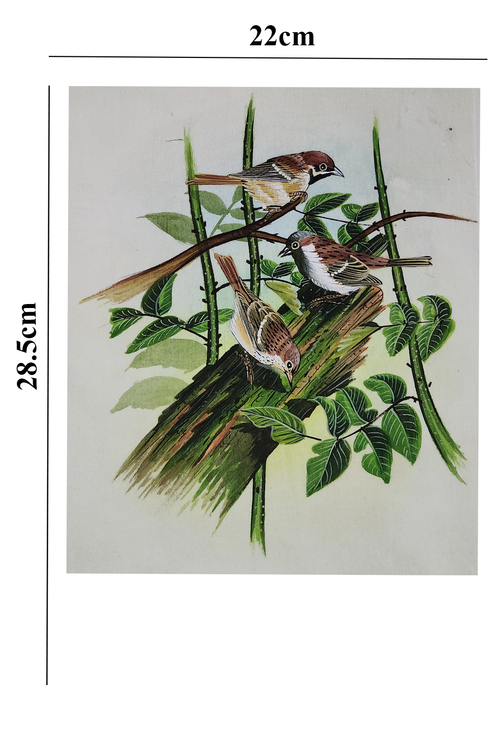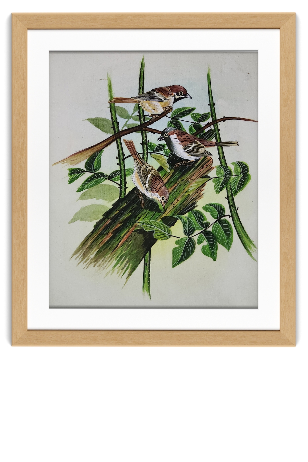 This watercolor painting captures a serene moment in nature, featuring three sparrows perched on branches surrounded by vibrant green leaves. The painting showcases: