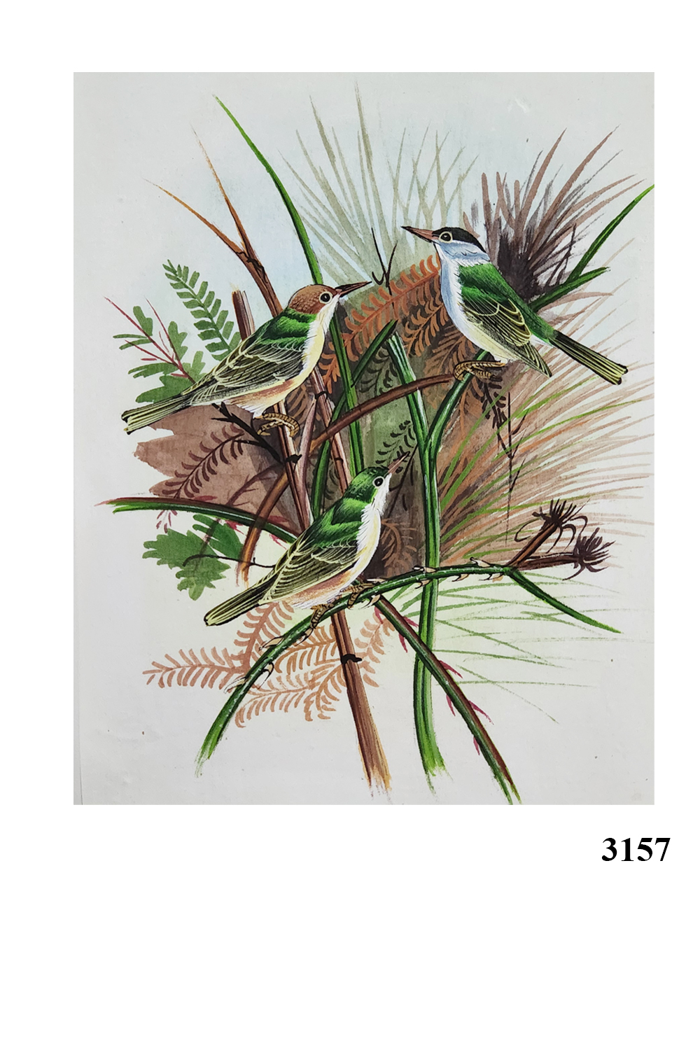 This watercolor painting captures the serene beauty of nature with three green-backed birds as the focal point. The painting features: