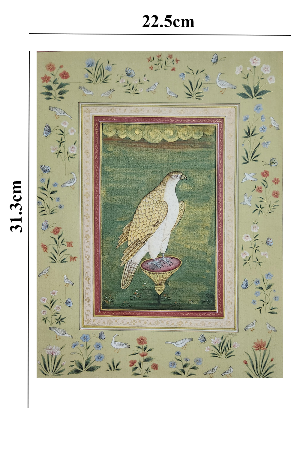 This exquisite miniature painting showcases a majestic falcon, meticulously rendered with golden feathers and a poised stance, perched on an ornate stand. The background features a rich green hue, bordered by intricate patterns. Surrounding the central image, the painting is adorned with delicate floral designs and various small birds, adding to the overall elegance and complexity. The attention to detail in the feathers, the harmonious color palette, and the intricate border work highlight the artist's skill and dedication to traditional miniature painting techniques.