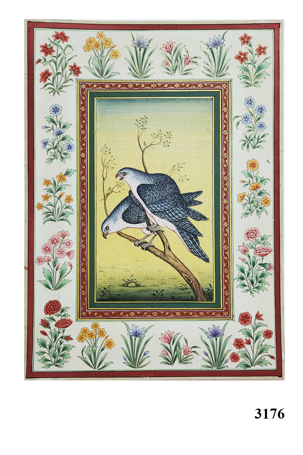 This exquisite miniature painting showcases two falcons perched on a branch, surrounded by a vibrant floral border. The painting features: