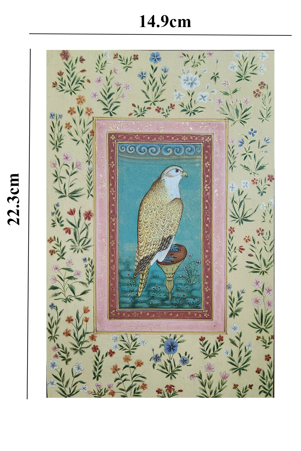 This exquisite miniature painting showcases a regal falcon perched on a stand, set against a serene blue background. The painting is framed by an intricate border with pink and gold accents, adding a touch of elegance. The outermost border is adorned with a variety of delicate flowers and foliage, showcasing the artist's attention to detail and mastery of botanical illustration. The falcon itself is meticulously rendered, with fine detailing on its feathers and a proud, watchful expression. The use of vibrant colors and intricate patterns makes this painting a captivating piece of art.