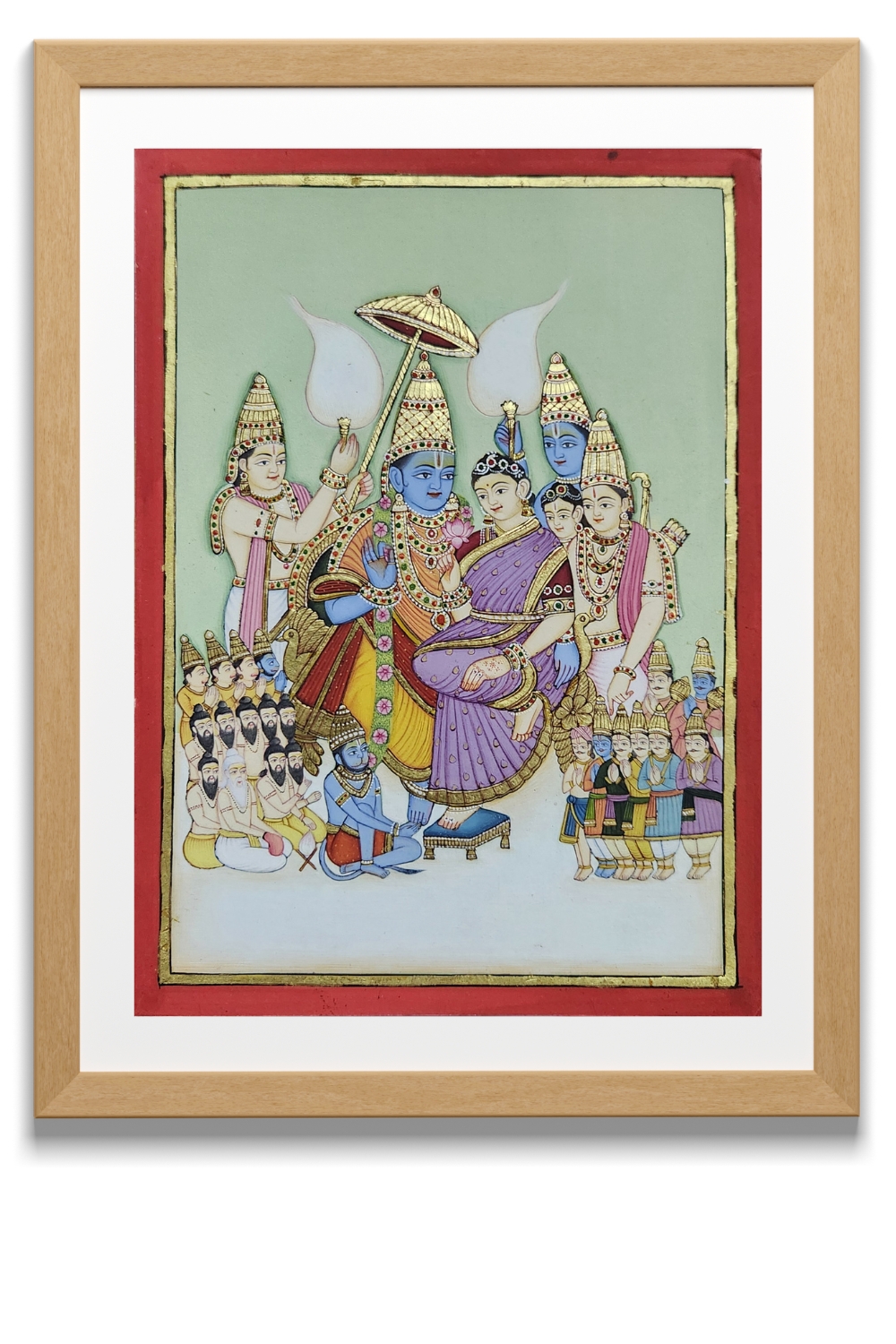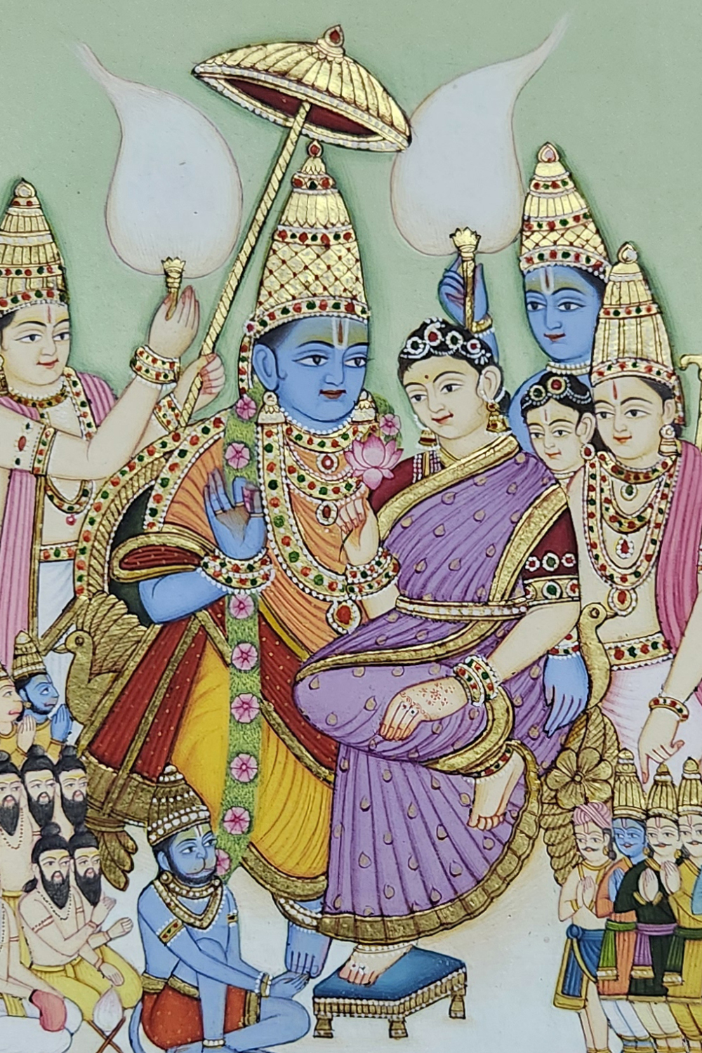 "Divine Assembly" captures the essence of a celestial gathering, showcasing intricate and vibrant artwork. The central deities, adorned in elaborate jewelry and traditional garments, are surrounded by attendants and worshippers, each figure meticulously detailed. Hand-painted using natural stone colors and gold leaf on paper, the artwork reflects the rich cultural and religious heritage of Rajasthan. The minimal background ensures that the central figures are the focal point, creating a striking contrast with the vibrant colors and gold accents.