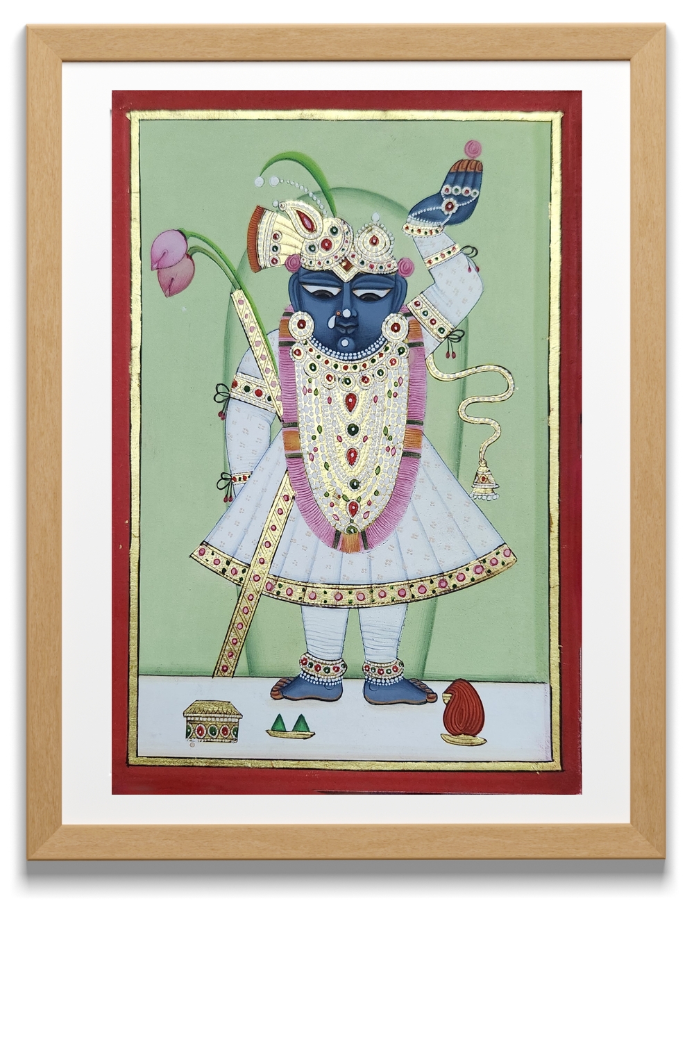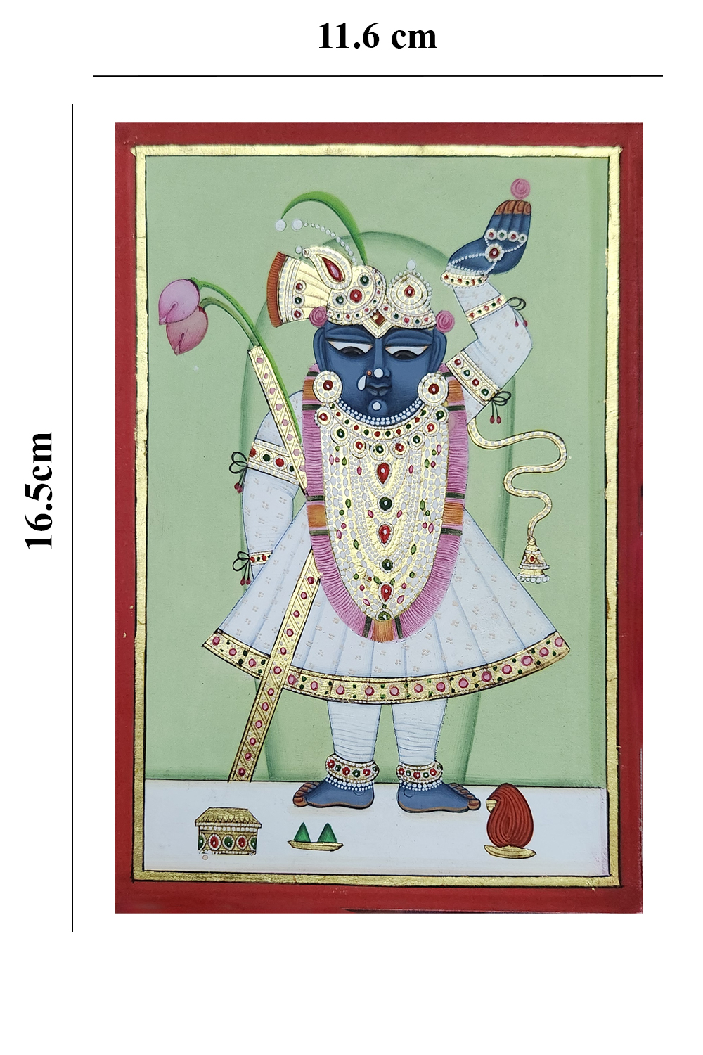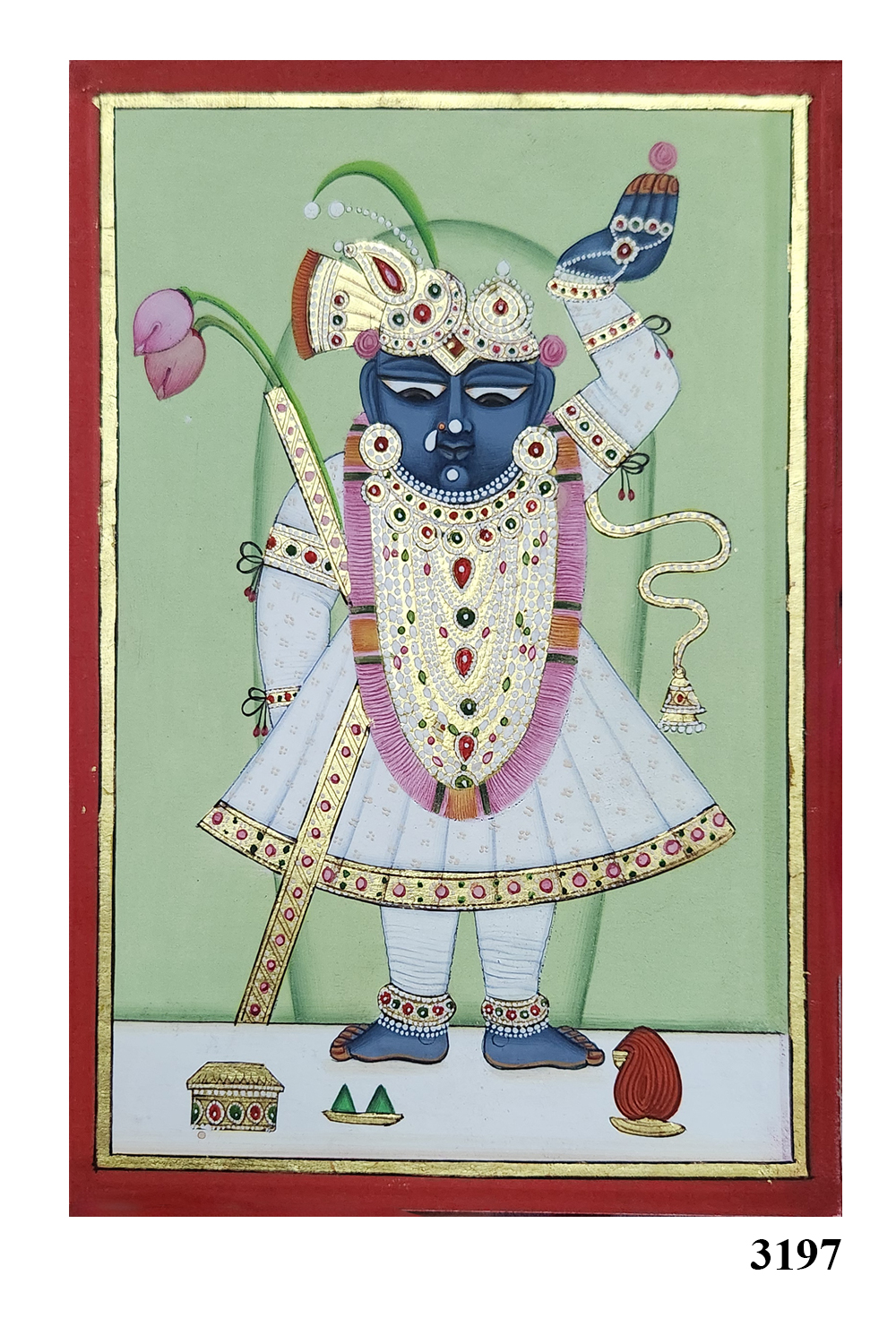 "Pichwai Painting of Shrinathji" captures the divine essence of Shrinathji, a revered deity in Hinduism. The painting features Shrinathji with a blue complexion, adorned with ornate jewelry and dressed in traditional attire. The background is a soothing green, which contrasts beautifully with the vibrant colors of the deity's attire and accessories. Intricate details such as the lotus flower, the elaborate headgear, and the decorative borders highlight the craftsmanship of traditional Pichwai art. Hand-painted using natural pigments and gold leaf on paper, the artwork reflects the rich cultural and religious heritage of Rajasthan.