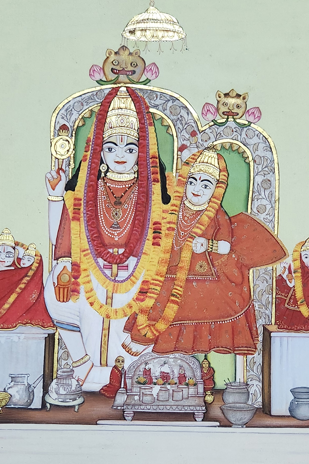 "Divine Couple in Traditional Attire" captures the regal essence of a divine couple, possibly representing deities, standing together with attendants on either side. The central figures are adorned with elaborate garlands, jewelry, and traditional clothing, highlighting their divine and regal nature. The background includes intricate architectural elements and decorative motifs, adding depth and context to the scene. Hand-painted using natural pigments and gold leaf on paper, the artwork reflects the rich cultural and religious heritage of Rajasthan.