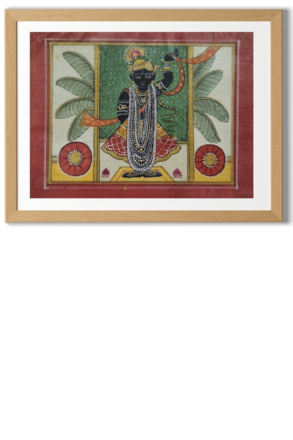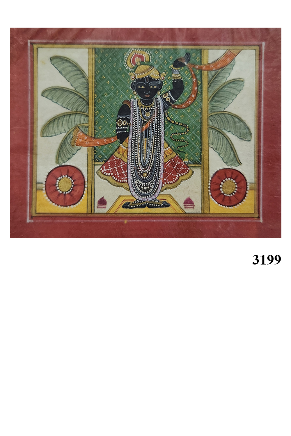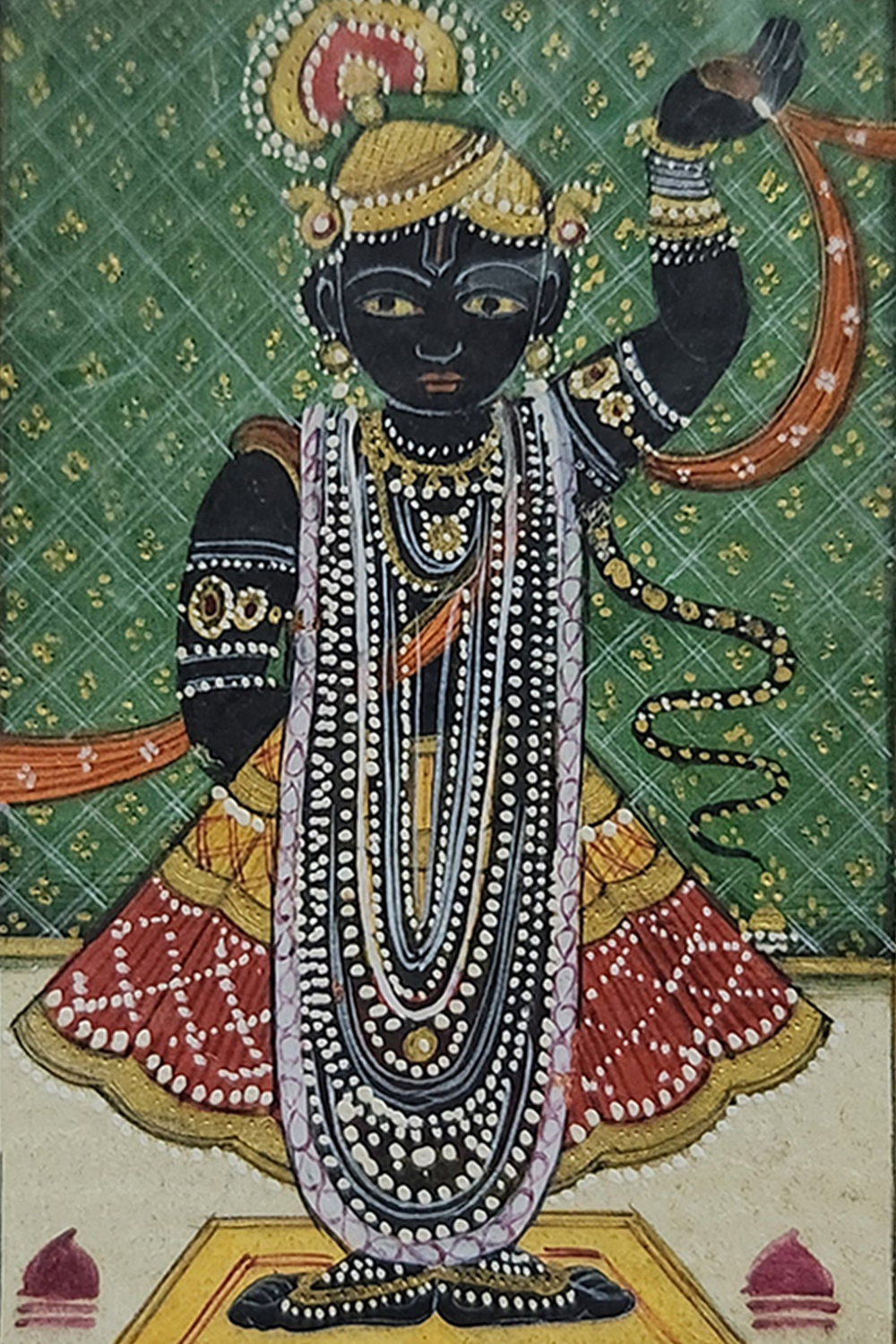 "Krishna with Flute" captures the divine essence of Lord Krishna, depicted with dark blue skin, playing a flute. The deity is adorned with elaborate jewelry and a crown, and dressed in a red and yellow garment. The background features lush green foliage and decorative elements, with two large red flowers on either side, highlighting the rich cultural and religious heritage of India. The intricate detailing and vibrant colors make this painting a captivating piece of art. Hand-painted using natural stone colors and gold leaf on handmade paper, this artwork reflects the skill and craftsmanship of traditional Indian miniature painting techniques.