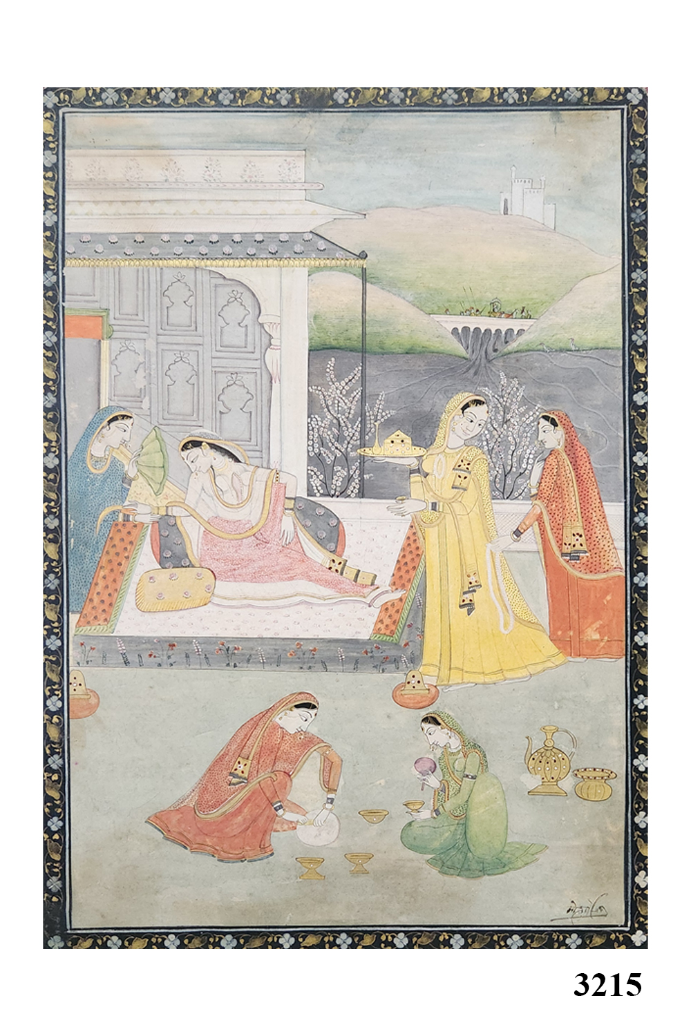 The background features ornate palace architecture and floral motifs, enhancing the grandeur of the setting without overwhelming the central figures. The artist's exceptional skill is evident in the fine brushwork and harmonious composition, which balances intricate detailing with vibrant natural pigments and gold accents.