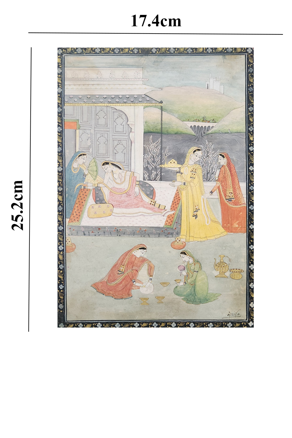 Product Content in Details: Royal Court Elegance is a masterpiece of traditional Indian miniature art, meticulously crafted to depict a serene yet lively moment in a royal palace. The painting features a group of women dressed in elaborately patterned garments and adorned with intricate jewelry, reflecting the luxury and refinement of courtly life. Their graceful poses and delicate expressions add a touch of intimacy and authenticity to the scene.